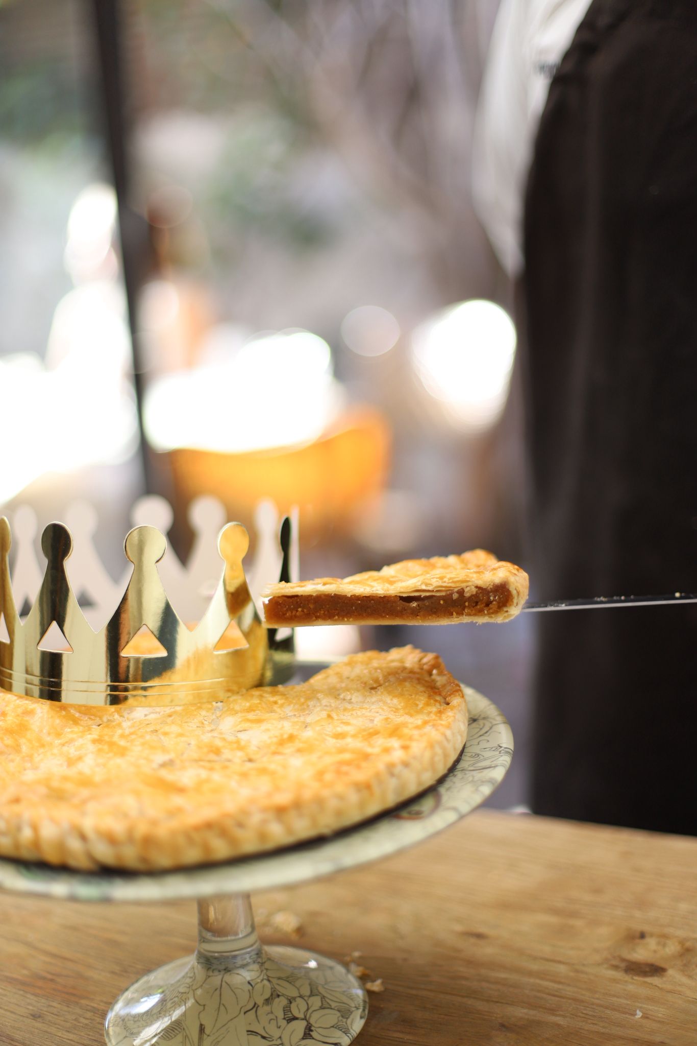 A French tradition celebrating the Epiphany. Its golden, glazed, a puff pastry filled with delicious almond frangipane, hiding a « fève » inside. Whoever has the « fève » wins the crown!