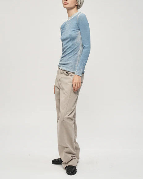 The 6397 Darted Pant in Oat Milk is a utilitarian-inspired trouser crafted in Italy from 100% lightweight, garment-washed cotton. These pants feature a unique relaxed silhouette characterized by a side seam that starts at the hip and twists toward the front, stopping at the knee to create a contemporary, structural edge. Designed with a high rise and a long length, they include a functional self-belt detail attached at the back for easy cinching, oversized back pockets with sewn-down flaps, and a distinct cuff detail at the bottom hem. Finished with traditional five-pocket styling, rivet details, and a zip-and-button closure, these pants offer a sophisticated yet boyish aesthetic in a soft, versatile neutral tone.