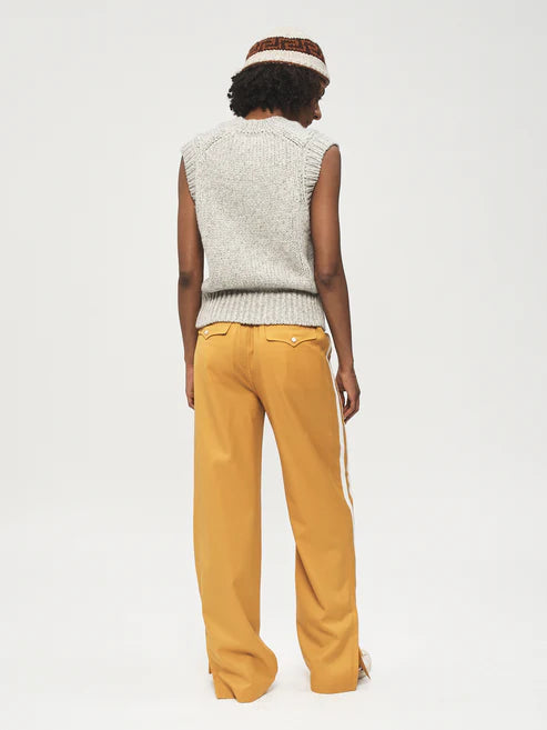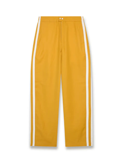 The 6397 Track Pant in Marigoldmade from premium Japanese wool-polyester blend (40% wool, 60% poly), these pants feature a striking marigold color accented by a contrast white racing stripe along the side seams. Designed for a relaxed, straight-leg fit with a mid-rise, they offer functional details such as an easy pull-on elasticated waist with a snap-and-zipper closure, side slit pockets, and Western-inspired back flap pockets with pearl snap buttons. A unique performance feature includes 10-inch hidden zippers at the bottom hems, allowing the wearer to adjust the leg opening to their preferred width for a versatile silhouette.