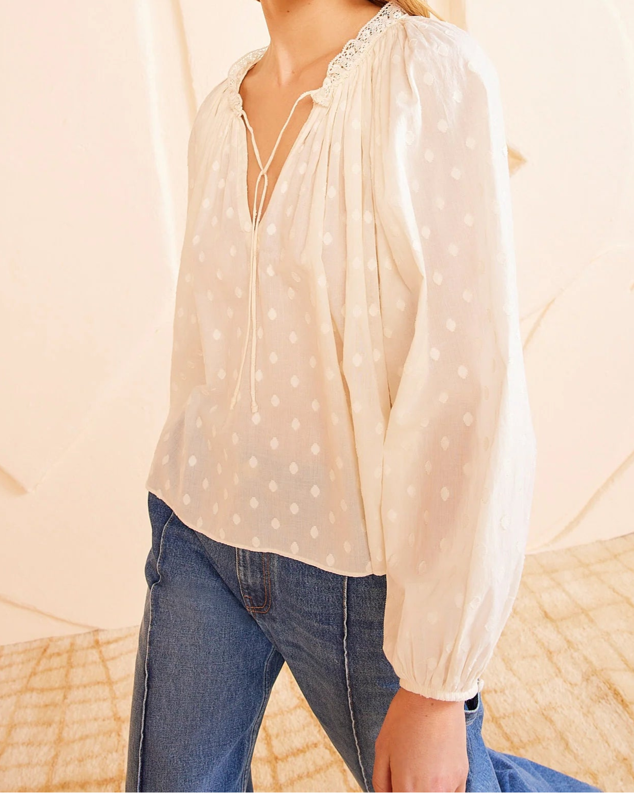 The Ada Blouse Pristine is an ethereal top crafted from delicate cotton dobby, featuring charming polka dots, a loose and airy silhouette, voluminous long sleeves, and intricate lace details at the neckline. The neckties can be tied or let loose for a carefree vibe.
