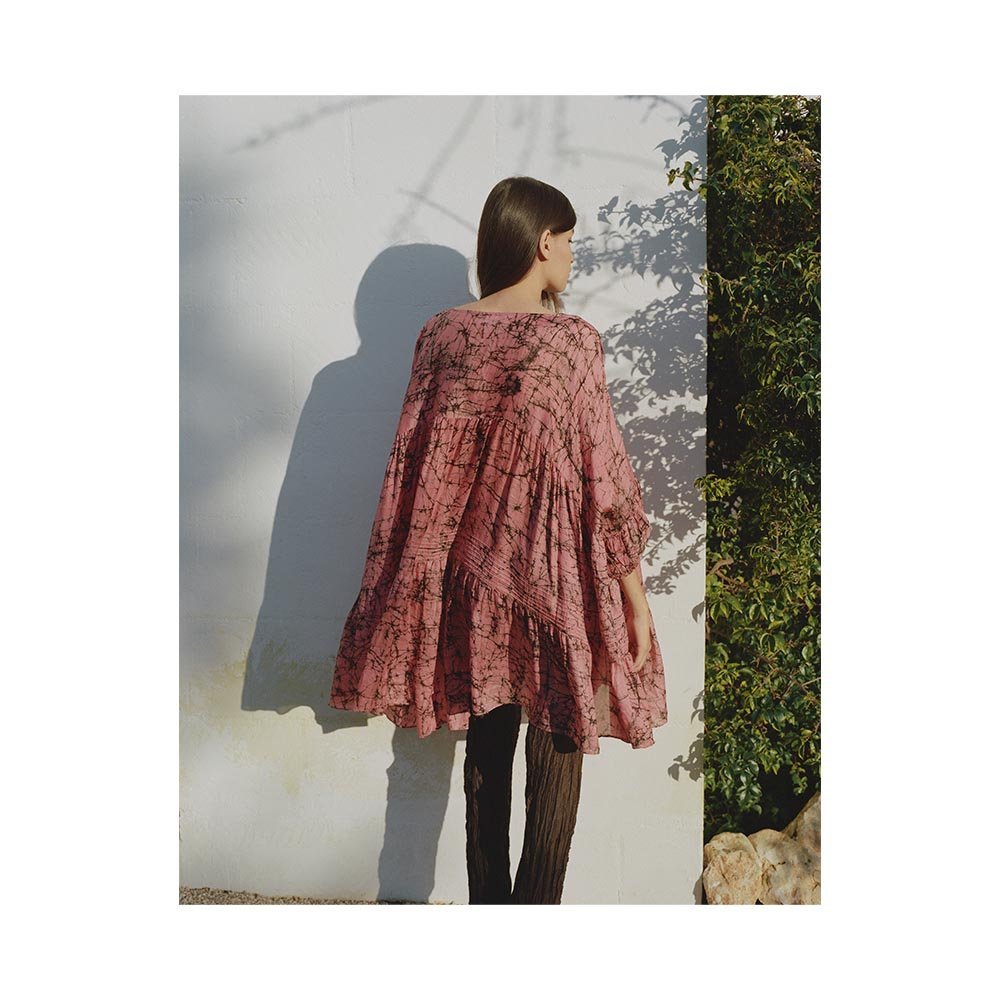 Introducing the Airi Mini Dress in a specialized tissue silk indigenous to India with artisan hand Batik. This style has the same Airi oversized fit, but in shorter knee-length silhouette. It billows with a deep v-neckline, 3/4 length cocoon sleeves with elastic cuffs, micro pleating detail and tiered skirt.