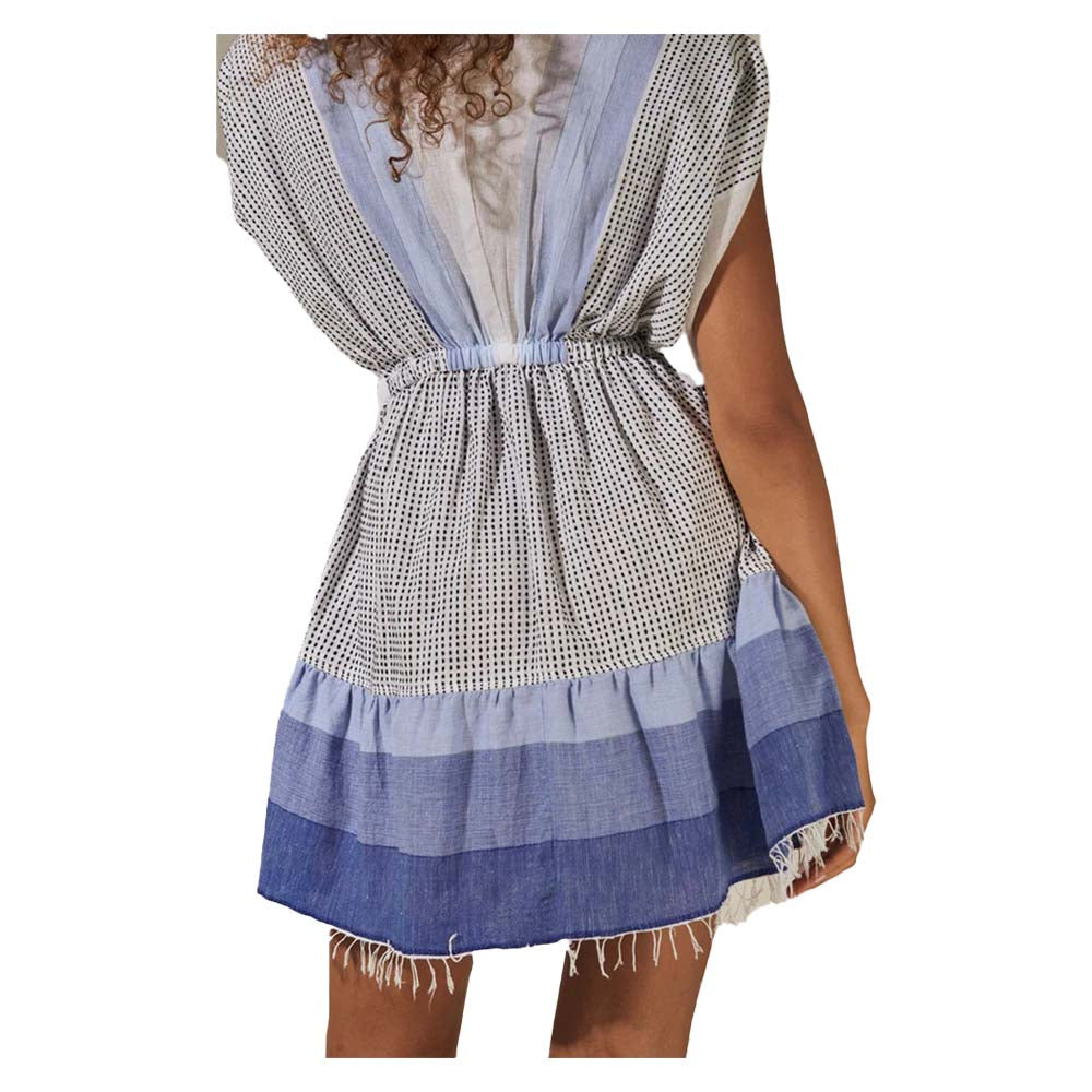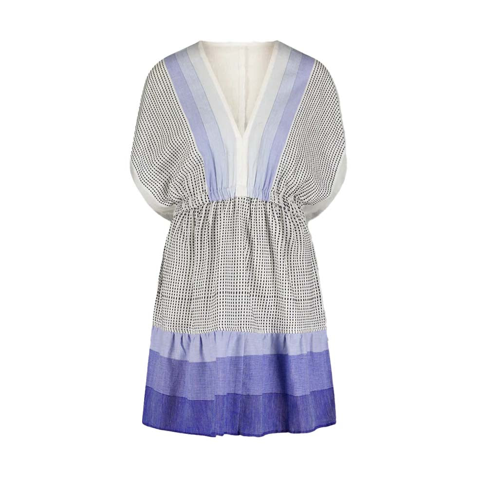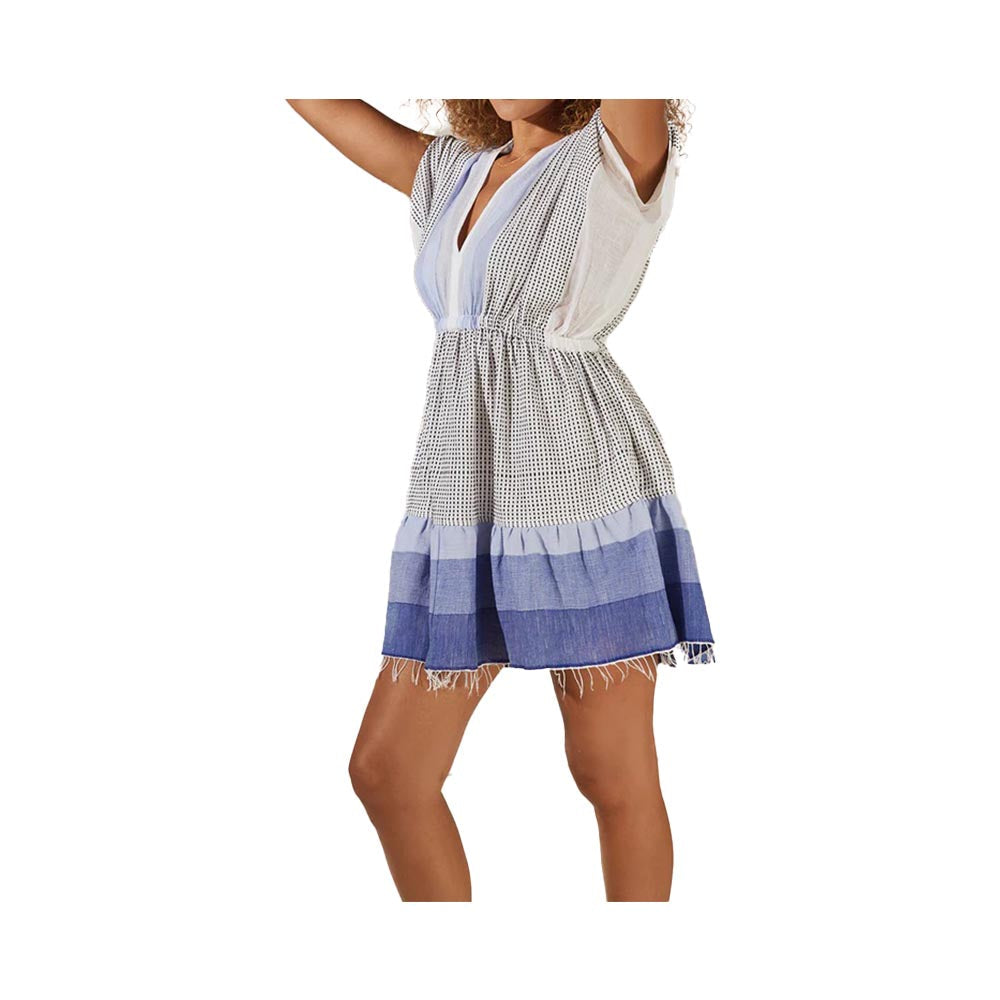 Featuring a textural dot pattern contrasting with asymmetrical denim blues, the Alem Plunge Dress is a versatile short dress. With dolman sleeves, a deep plunge neckline, and a comfortable elastic waist shaping an hourglass silhouette, it becomes a resort wear staple, elevated by a stylish ruffled hem.