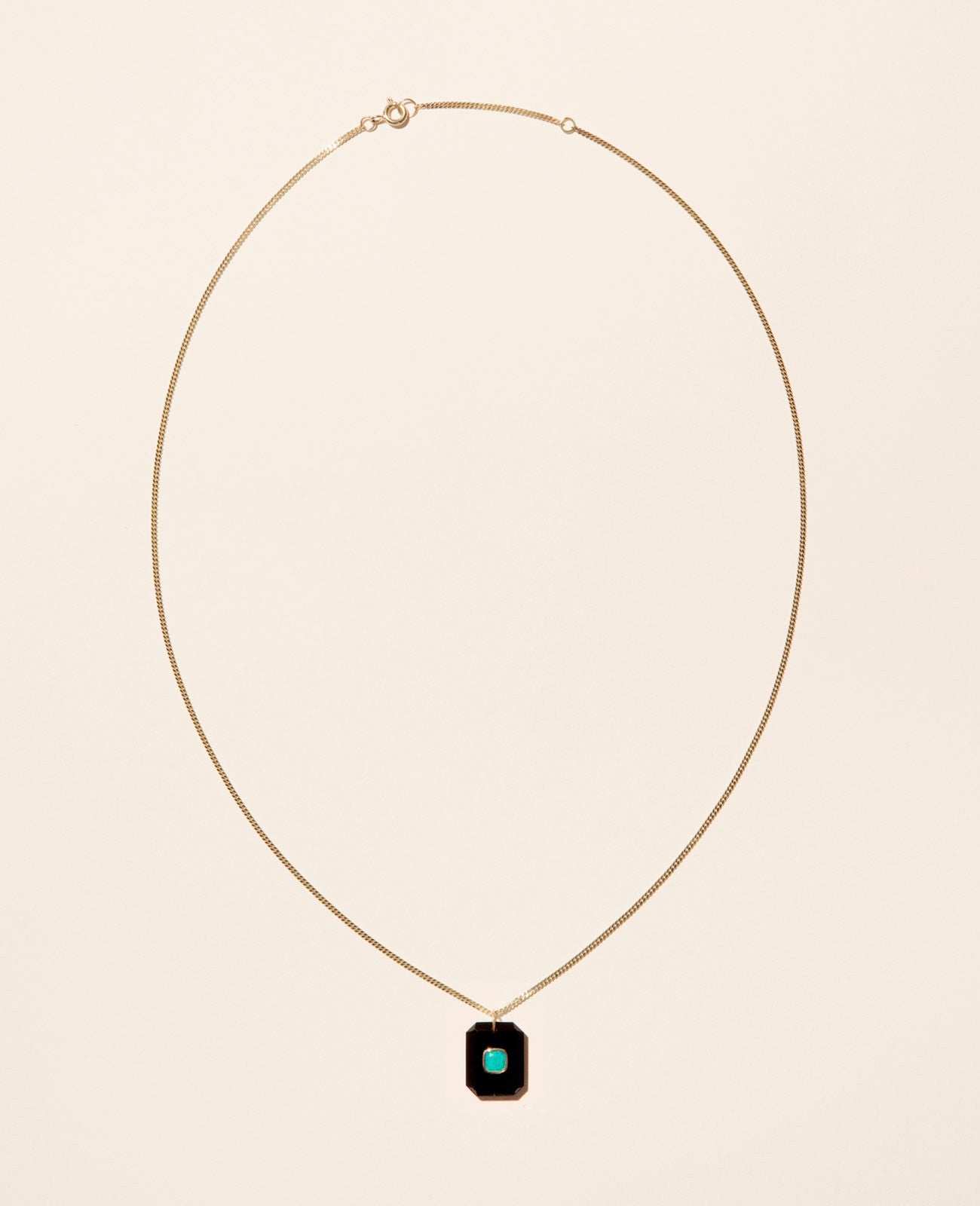 An emerald-cut caviar-black onyx, embedded with an iridescent opal. A seventies-inspired necklace on a curb chain.