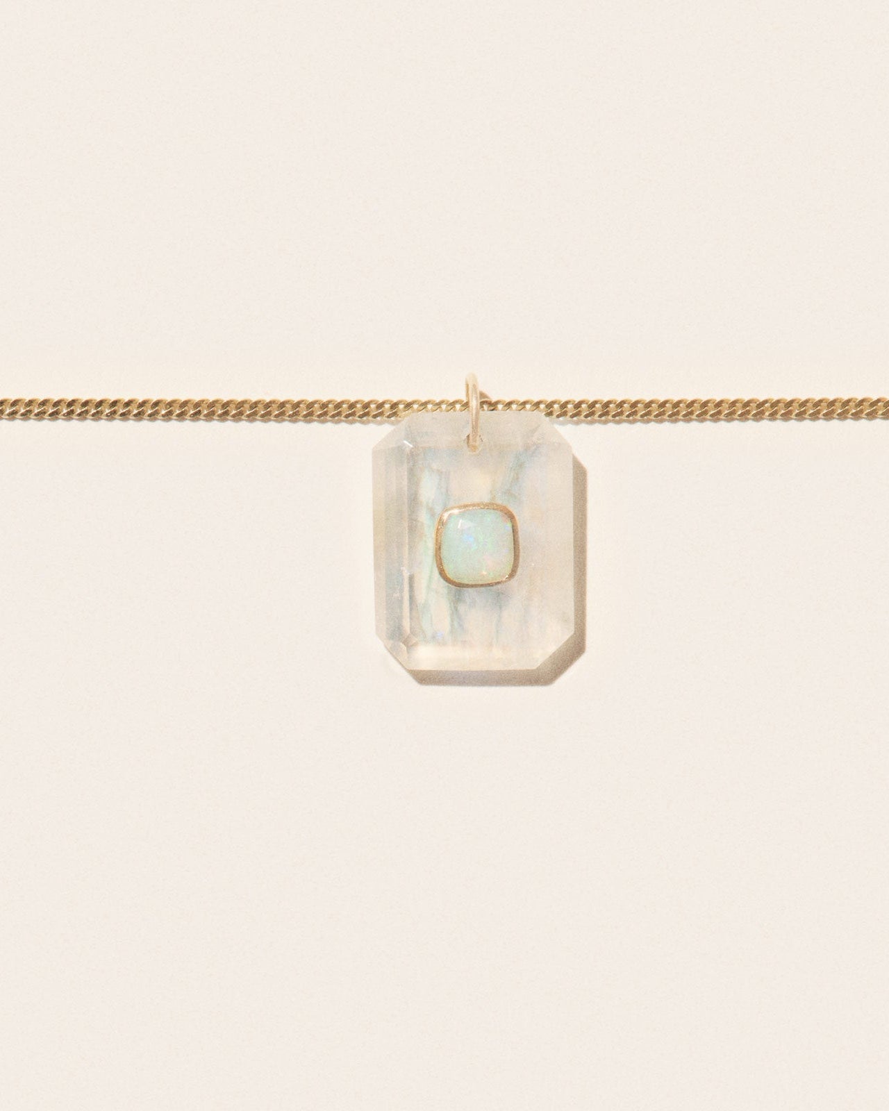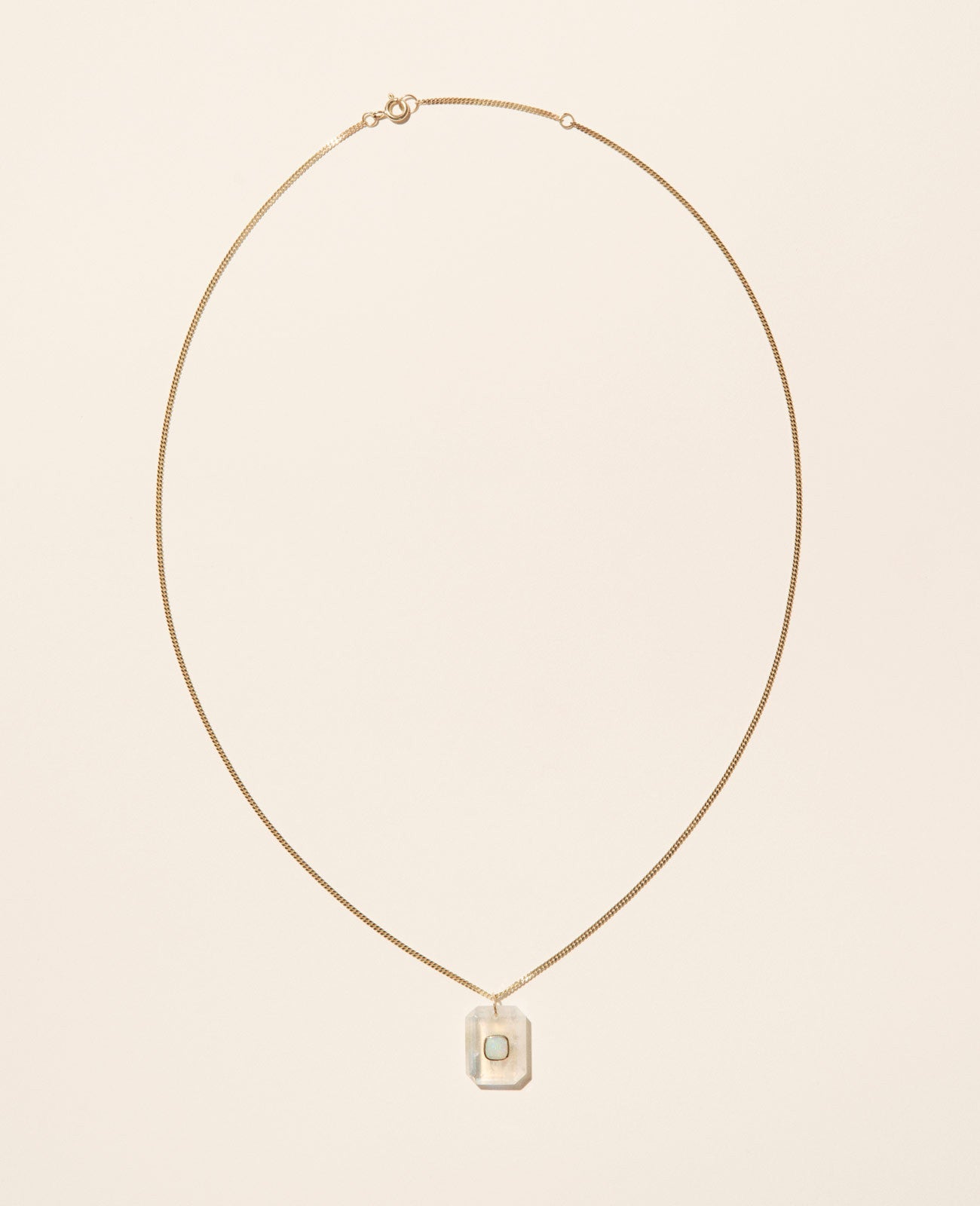 A translucent emerald-cut moonstone with a milky shimmer, embedded with an iridescent opal. A seventies-inspired necklace on a curb chain.
