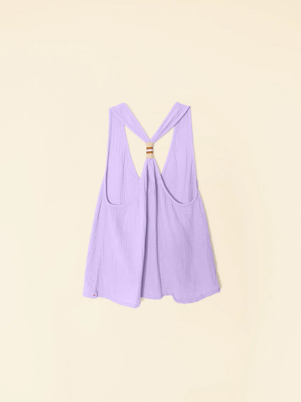 Xirena's Axl top is made of washed double sided cotton gauze, which gives it a lovely, gently crinkled feel. This top has a deep V-neck and racerback, with a color-blocked faux leather wrap.