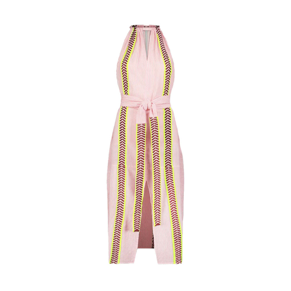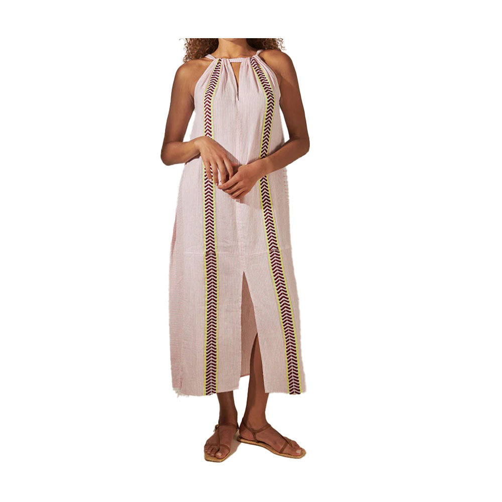 Lemlem's Ayana dress in the Kesiti collection exhibits delicate pink stripes adorned with a bold chevron-patterned ribbon, complemented by muted tones of pink, burgundy, and a vibrant citrus-orange hue. The long dress boasts a V-neckline, shoulder ruching, a back tie, a front slit skirt, and a wrap obi belt that cinches the waist. With an adjustable neckline and waist, the dress offers a customized fit, while the flowing, fluid silhouette exudes feminine elegance.