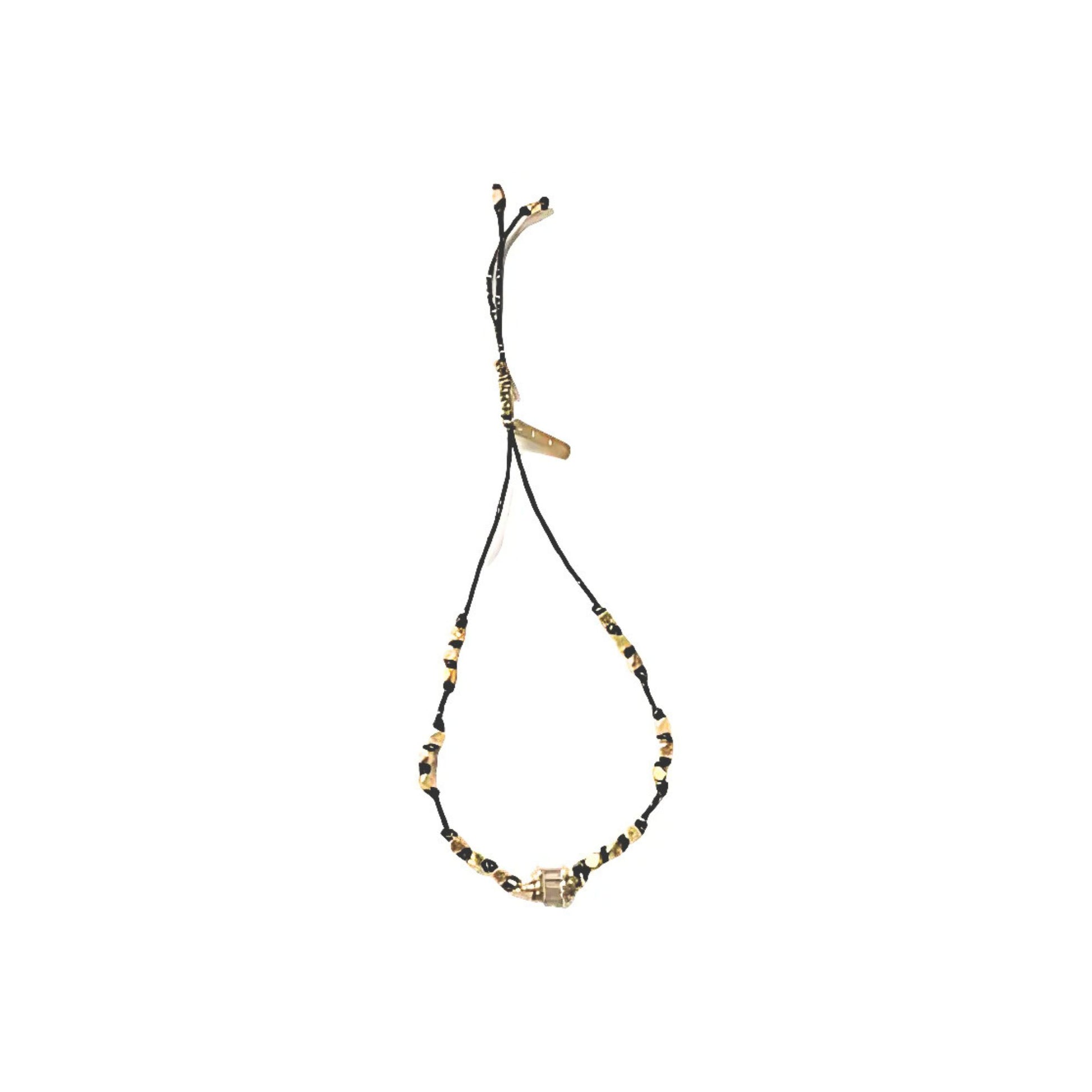 This bracelet from Hanka In has a black colored thread with gold plated accents and zircon stone.