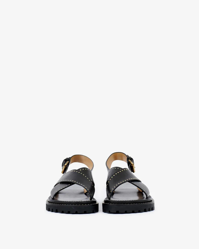The Baem Sandals by Isabel Marant are flat studded leather sandals with a buckle ankle strap and thick sole.