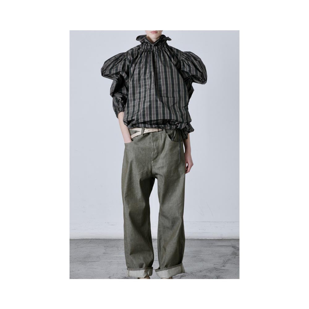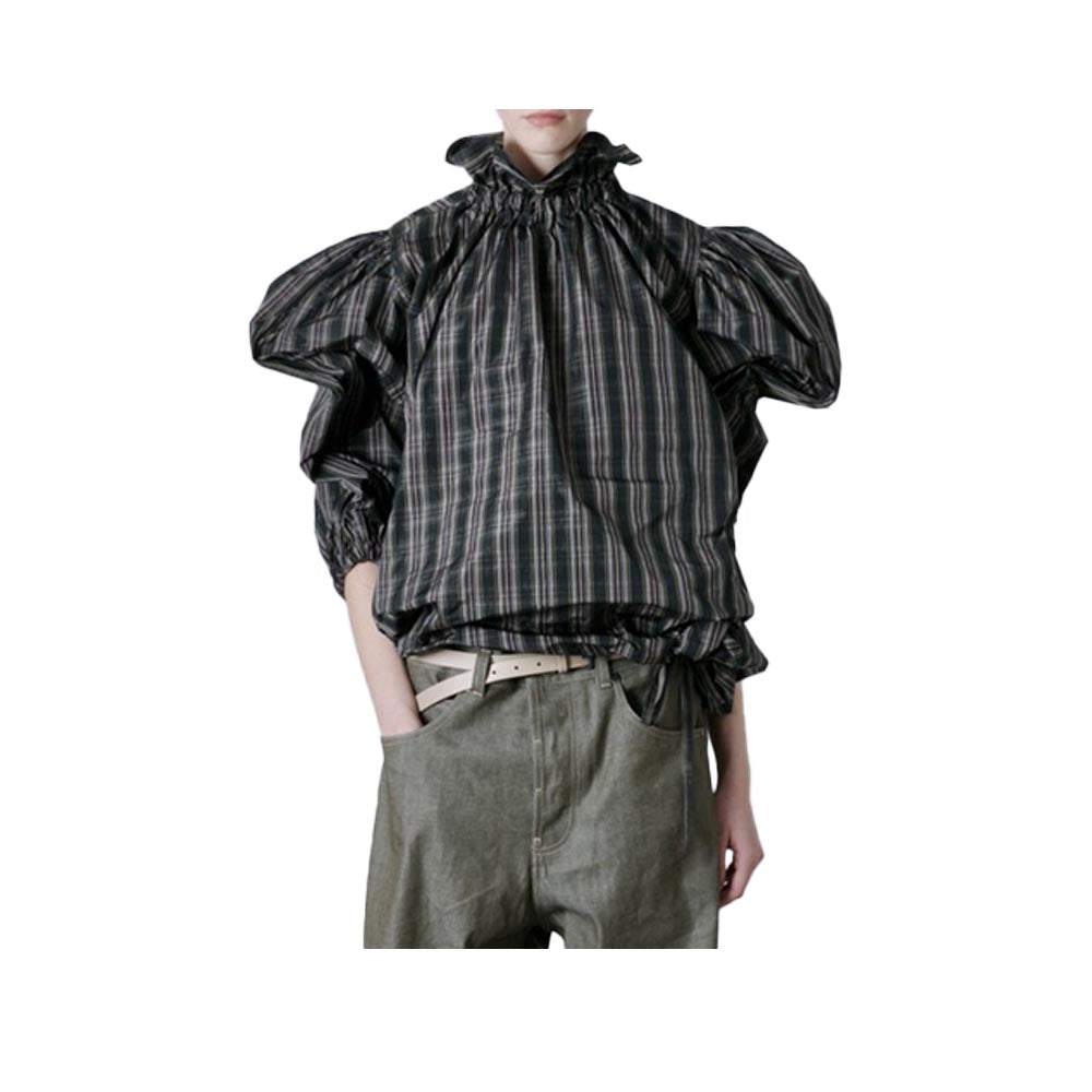 This ruffle collar top combines sophistication with a touch of playfulness. Puff sleeves and a drawstring waist offer an adjustable fit, while side seam pockets provide convenience. Made from 100% polyester taffeta, it's a stylish and versatile piece suitable for various occasions.