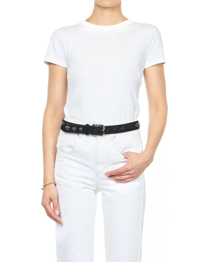 The Festival Belt by Jerome Dreyfuss features large domed metal rivet accents. It can be worn high-waisted or hip-high thanks to the adjustable waistline.