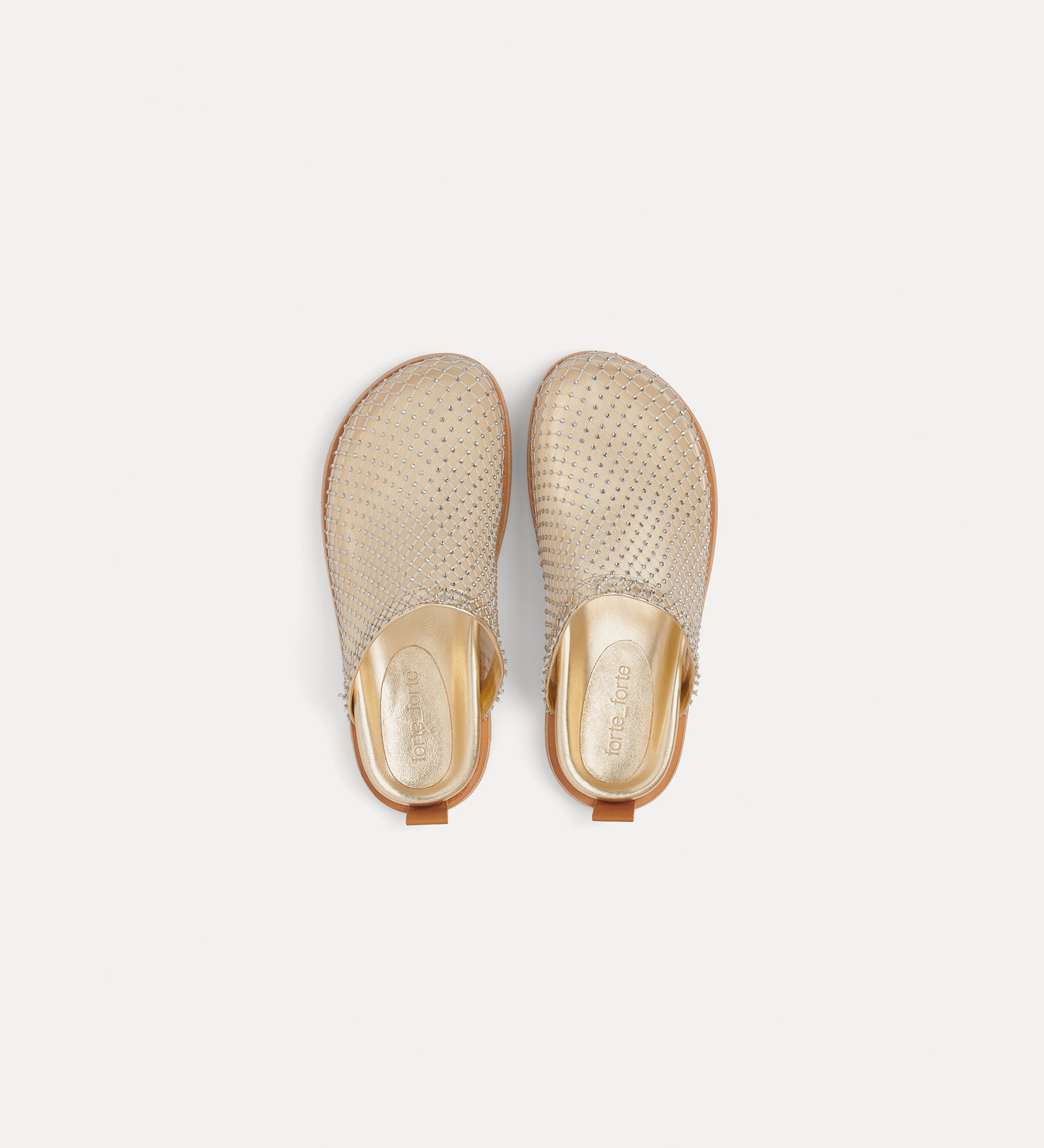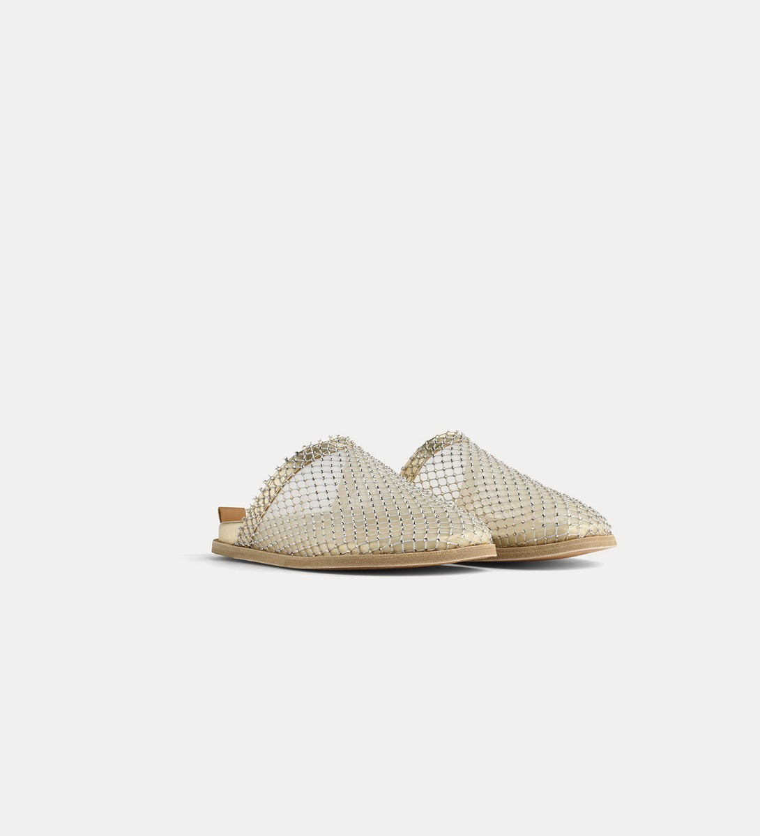 Delicate yet daring, this backless slipper features a semi-sheer mesh upper adorned with light-catching crystals. The double leather sole grounds the design, while the bare-foot effect adds a subtle, sensual edge to its sparkling silhouette.