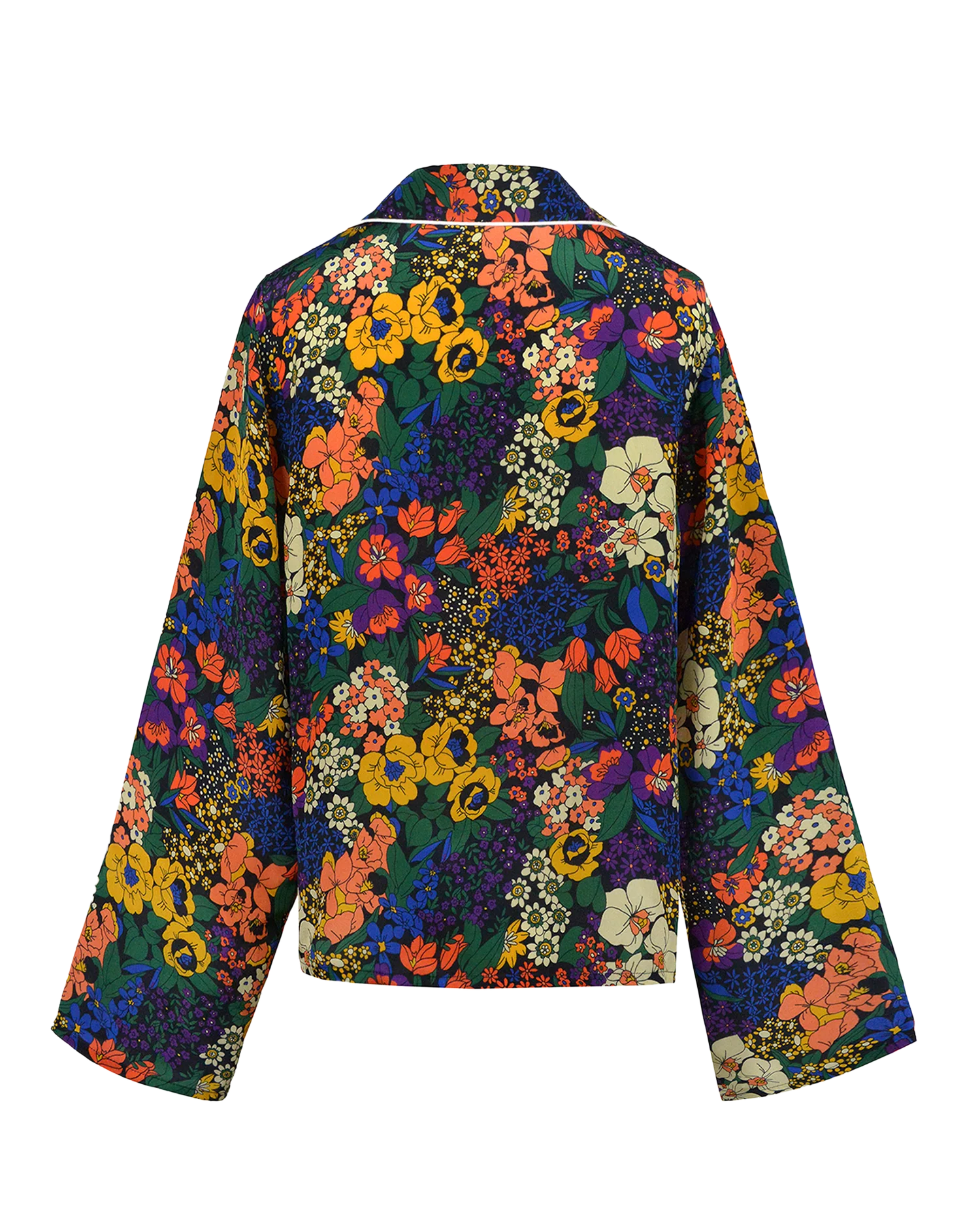 The Bouquet Shirt showcases a vibrant all-over floral print in a silk, lightweight fabric. Featuring a relaxed fit, notched collar, and button-down front with contrast piping, this shirt brings a lively and sophisticated touch to any outfit.