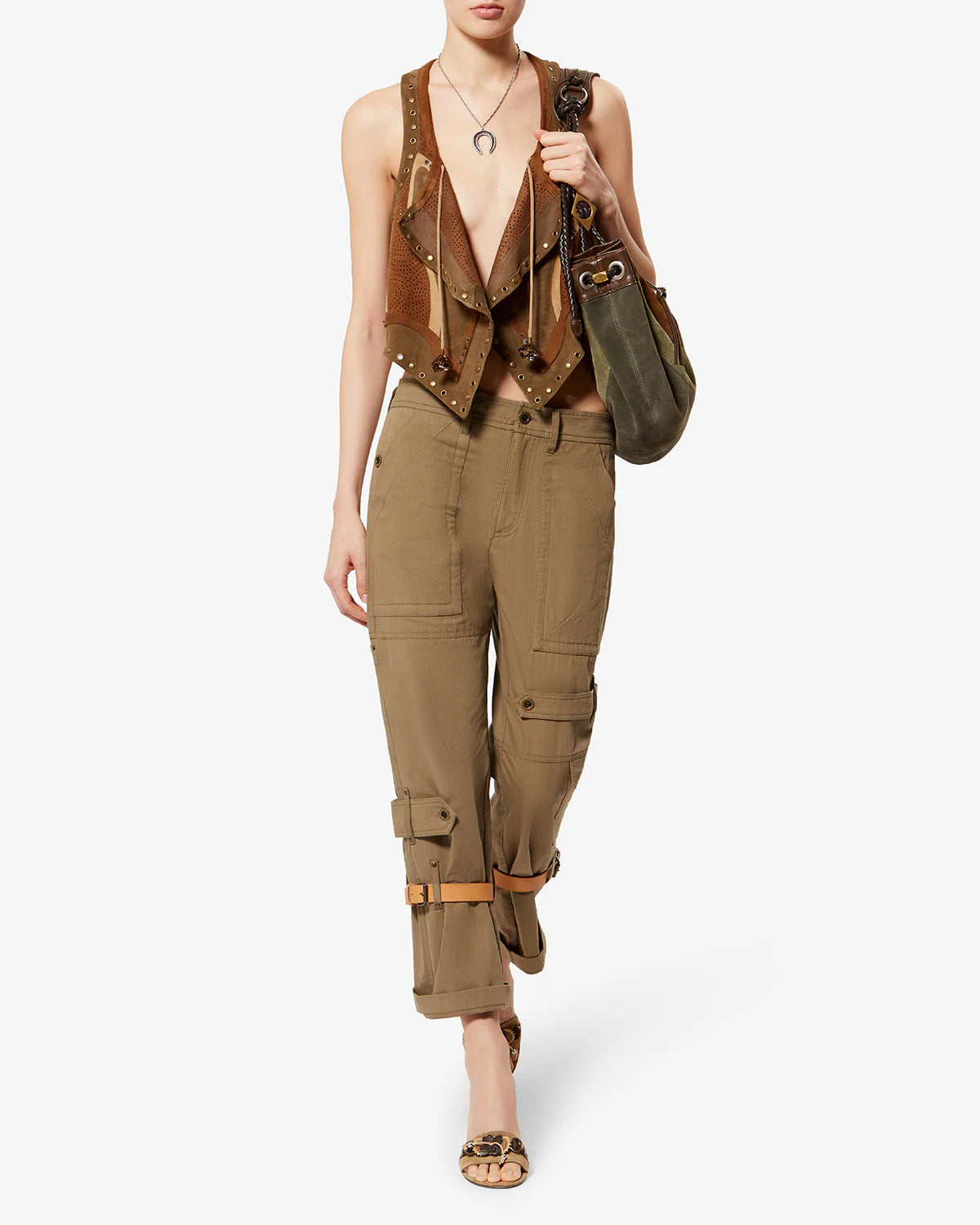 The Brinda Pants in khaki are cut from sturdy cotton canvas with a straight‑leg cargo silhouette, featuring a concealed zip‑and‑button closure, double side pockets, flap pockets on the legs, and buttoned welt pockets at the back for a structured, utilitarian feel. A classic waistband with belt loops is paired with adjustable cotton straps and removable leather straps finished with vintage‑style metal buckles, giving the design a functional, rugged edge while maintaining Isabel Marant’s refined, effortless attitude.