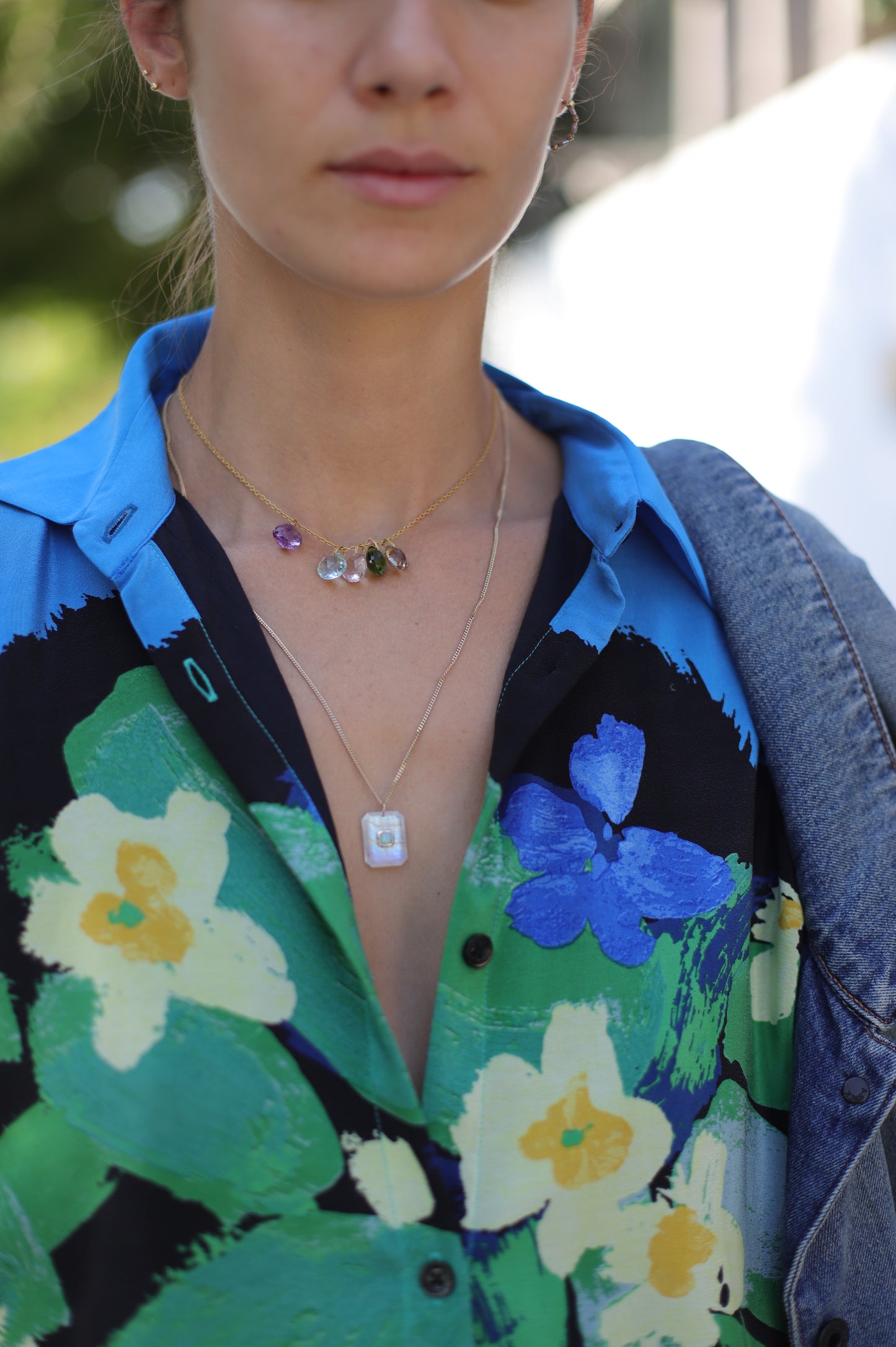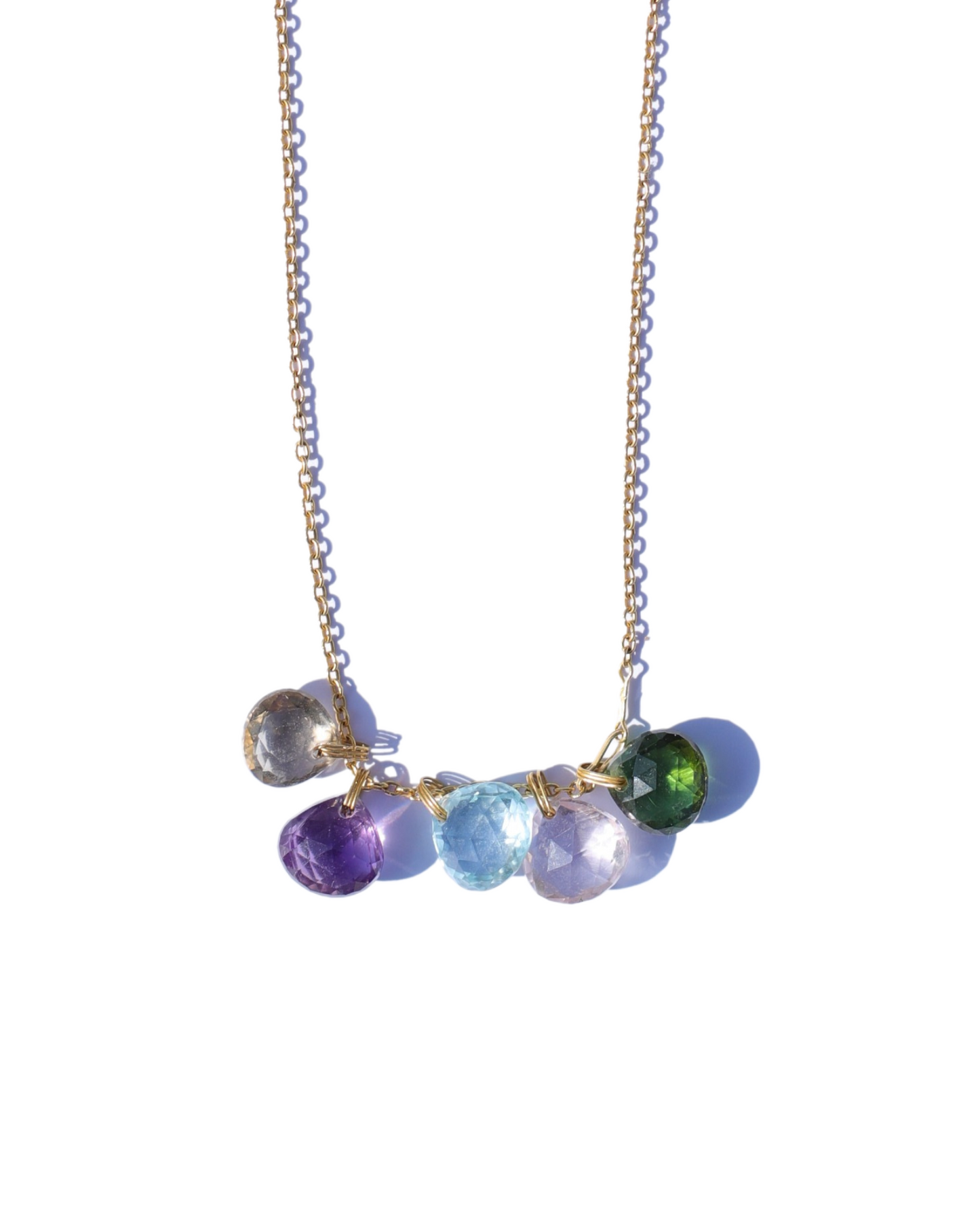 yellow gold chain with briolette cut gem charms - amethyst, green quartz, blue quartz, and rose quartz.