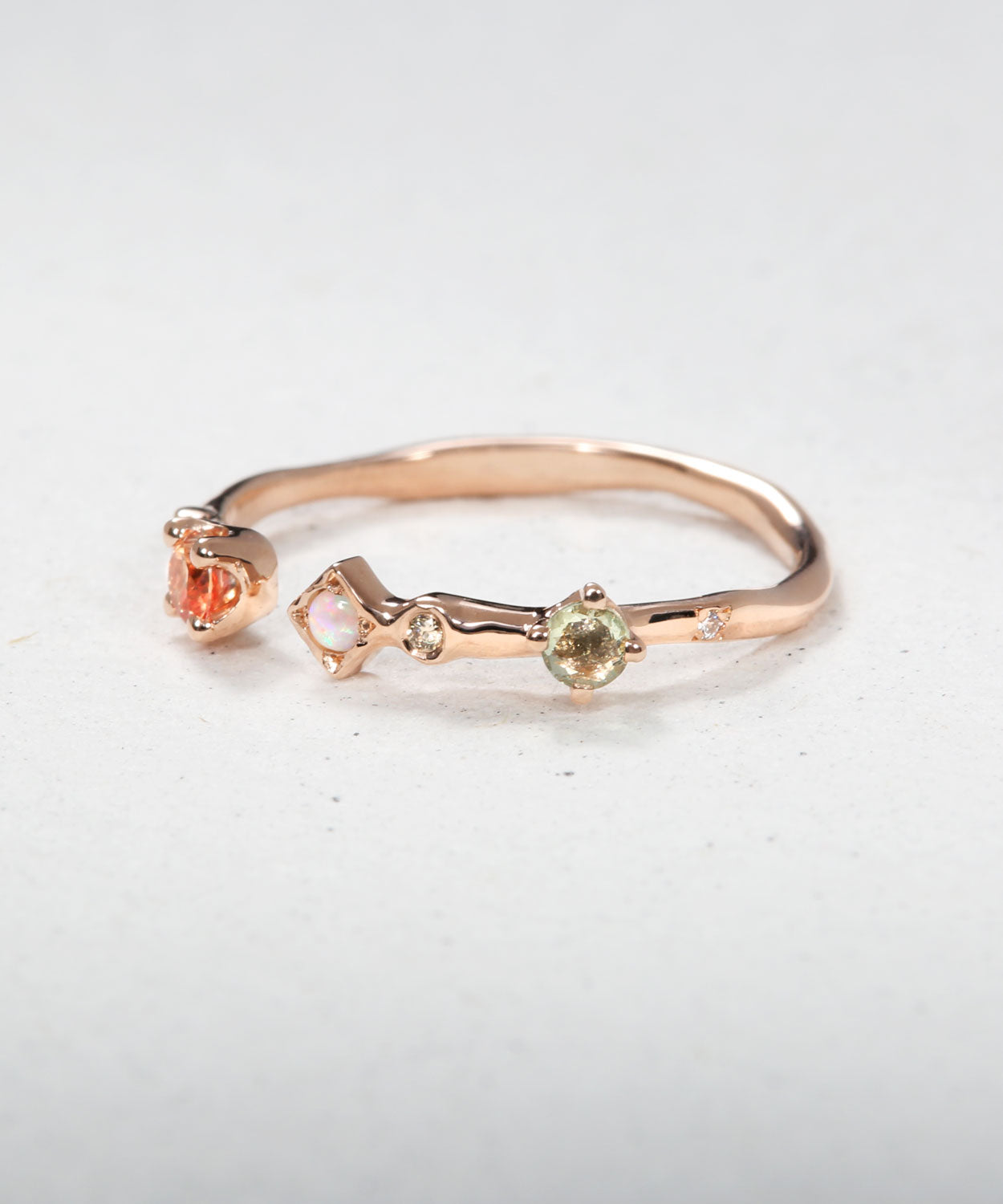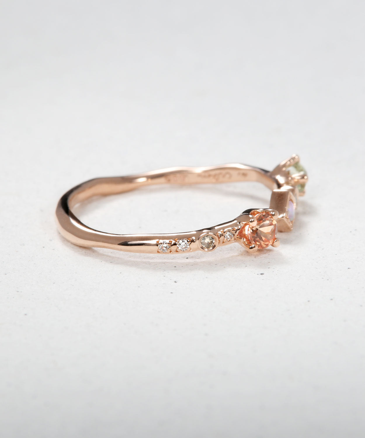 A dainty multi-colored stacking band featuring sapphires, opals, champagne and white diamonds.