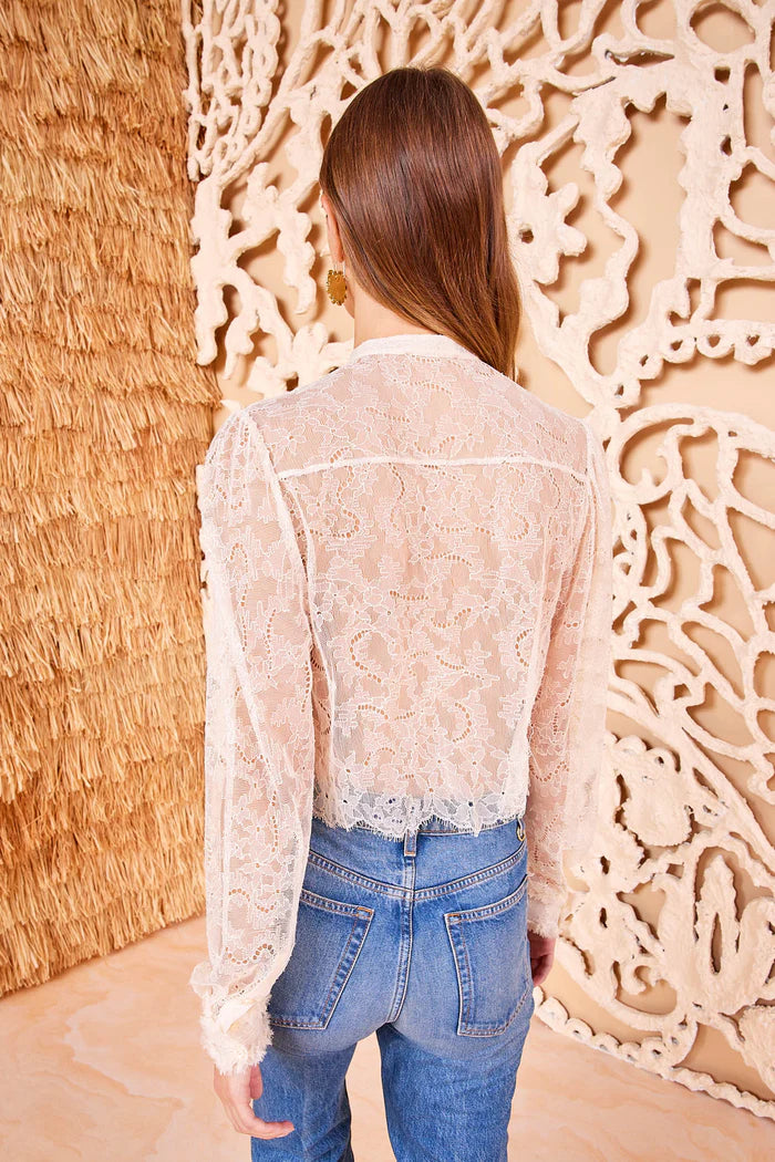 The Cecile Blouse is crafted from Chantilly lace and point d’esprit sourced from Italy. Adorned with floral patterns, this cowrie white top features a sheer silhouette with charming cascading ruffles a. IIt fastens with mother-of-pearl buttons through the front.
