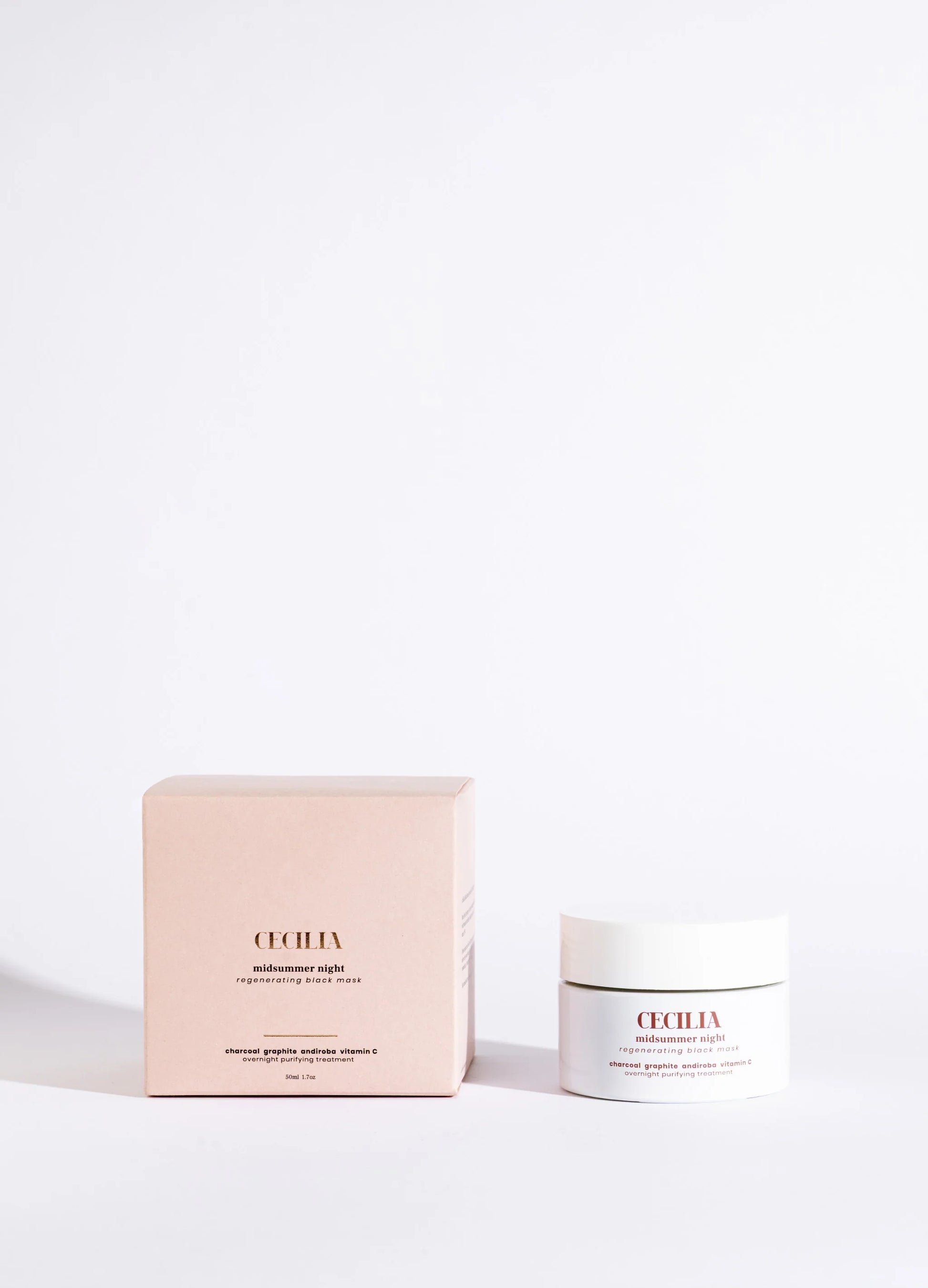 The Midsummer Night Regenerating Black Mask is a jet-black ointment-like treatment designed to deeply purify, soothe, and regenerate congested, reactive, or stressed skin. Its multi-correctional formula harnesses the power of Amazonian botanicals like Andiroba Oil (for anti-inflammatory and collagen support) and nourishing Evening Primrose Oil (rich in GLA). The mask detoxifies and unclogs pores using Birch Charcoal and exfoliating Graphite Crystals, while the stable Ascorbyl Palmitate (Vitamin C) brightens and evens skin tone. Infused with soothing Blue Tansy and antibacterial Blue Tamanu, it reduces redness, promotes regeneration, and can be used as a weekly mask or an intensive overnight treatment for a rebalanced, smoother, and radiant complexion.
