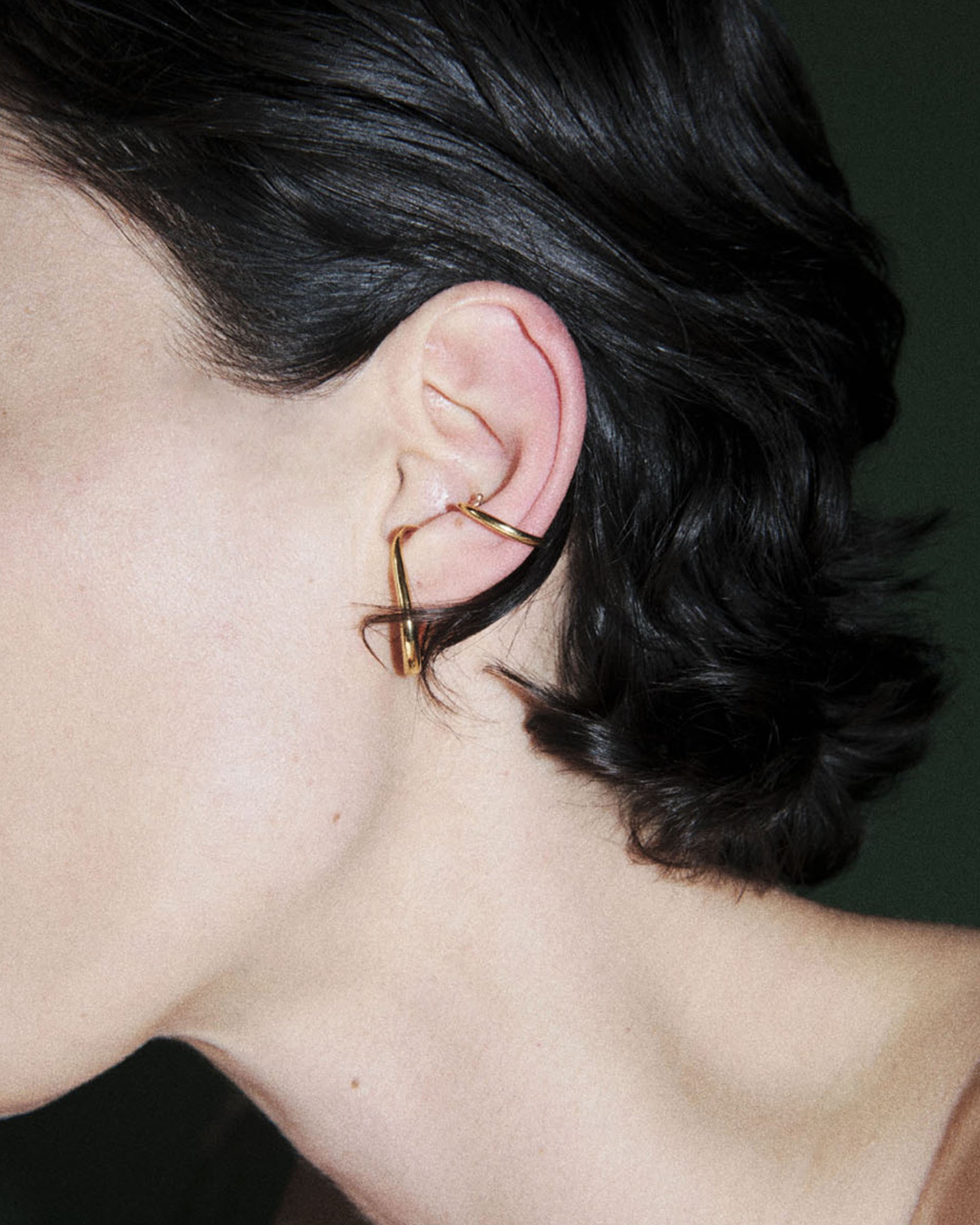 The Petit Mirage Cuff by Charlotte Chesnais is a sculptural ear cuff that elegantly wraps around the ear, creating a fluid silhouette. Crafted from 925 sterling silver and plated with 18-karat gold (vermeil), this piece offers a luxurious finish. Sold as a single earring, it's designed to be worn on the left ear.