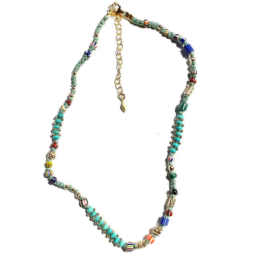 This necklace features handwoven details with 18K gold-plated accents, stunning turquoise gemstones, and African-inspired beads.