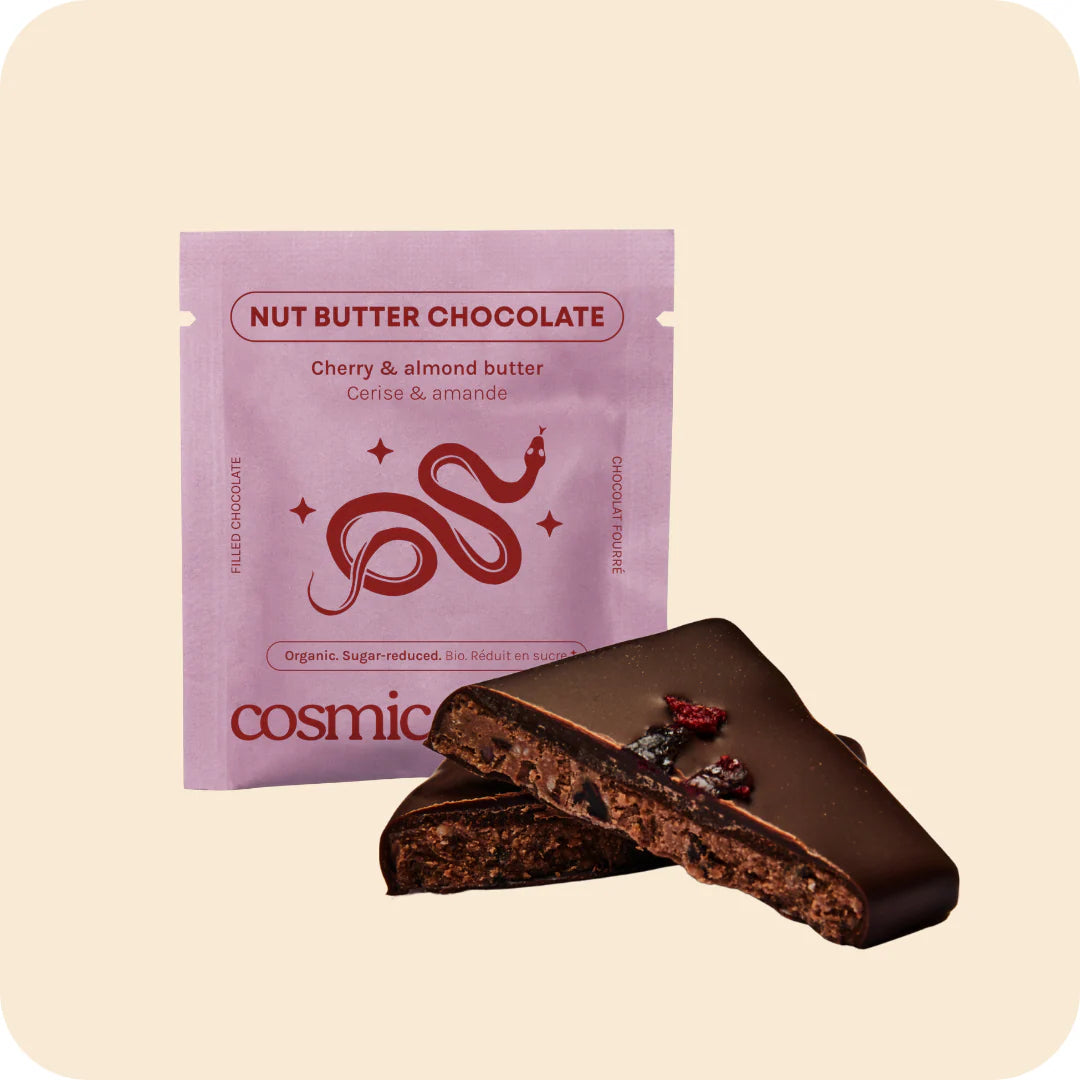 Blanched almond puree,* 75% Dark chocolate (cacao beans, dates), Cacao butter,* Cherries,* Morello cherries,* Cacao nibs*
