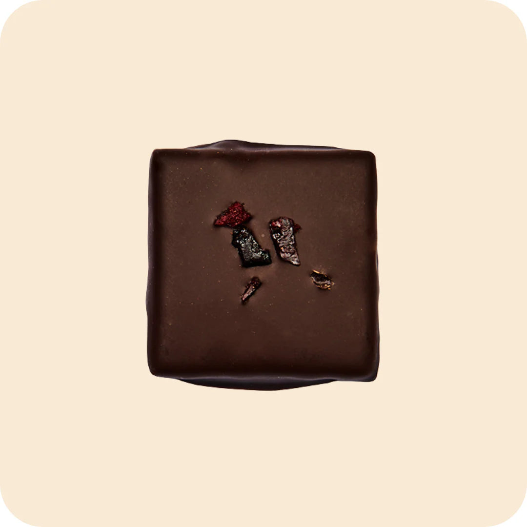 Healthy nut butter squares infused with botanicals, fruit, and flowers and dipped in dark chocolate. Our nut butter chocolates have 2g of sugar or less per chocolate, from dates. They are keto-friendly and have minimal effect on blood sugar levels.
