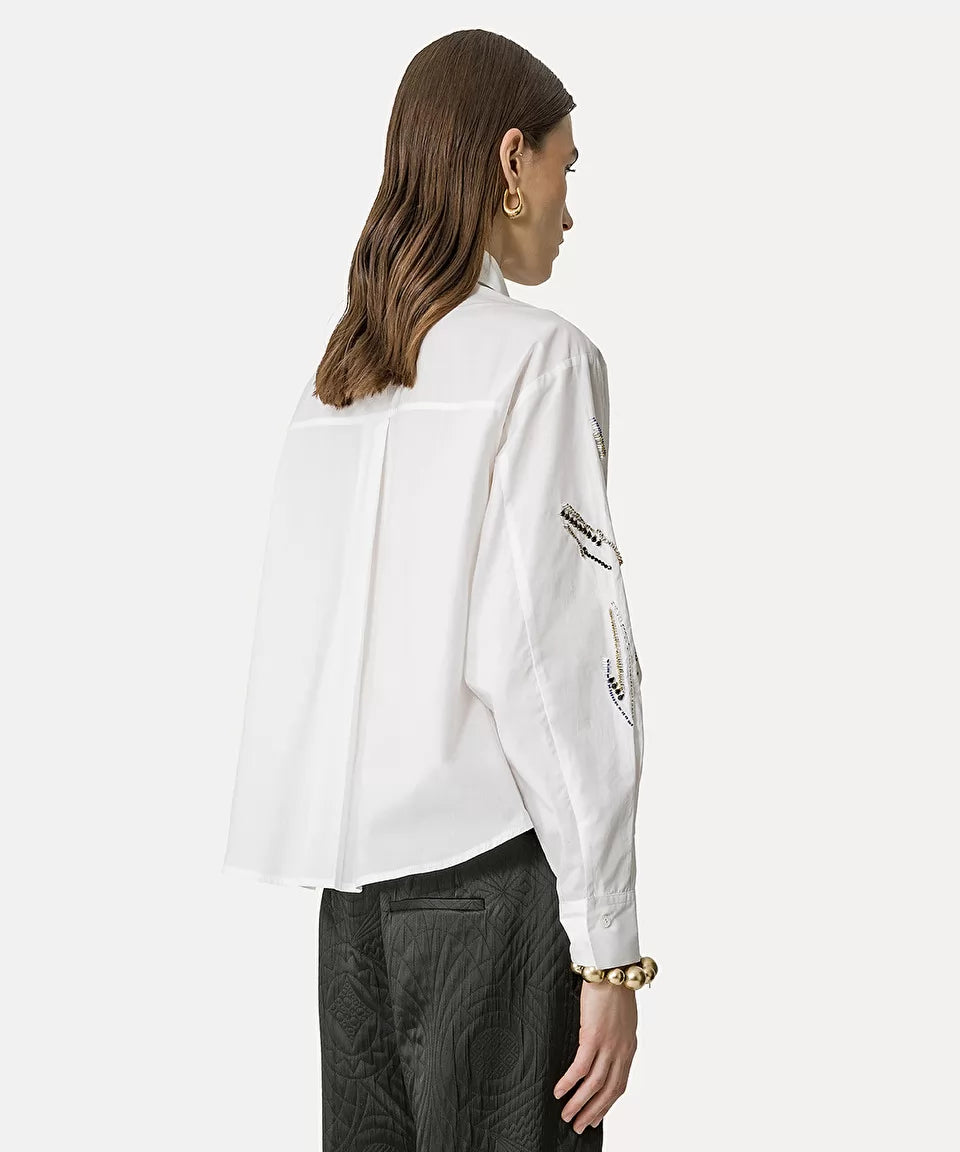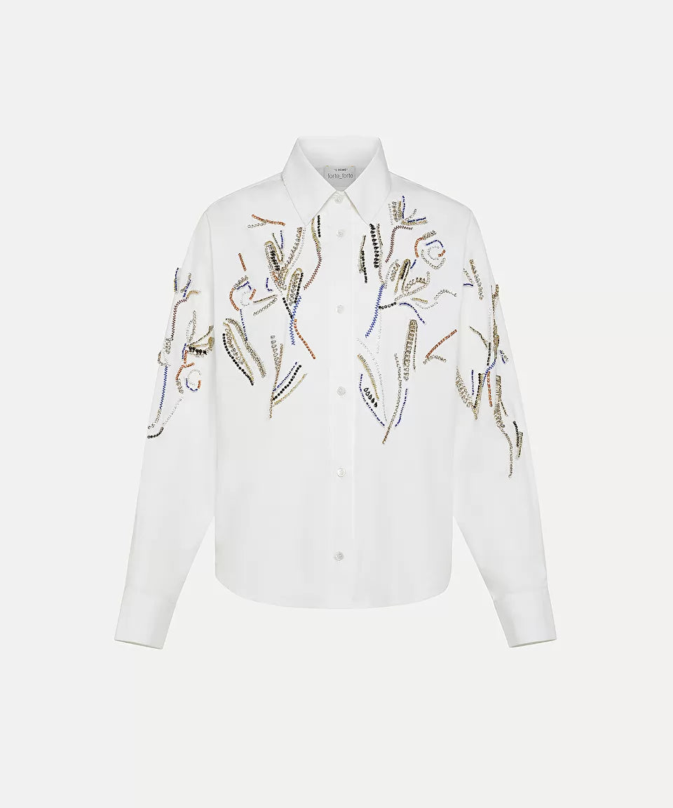The Crystal Rose Cotton Poplin Shirt by Forte Forte is a refined piece made of lightweight cotton poplin. It has a loose fit, dropped shoulders, and a button-front opening. The front and sleeves are embellished with hand-sewed crystals.