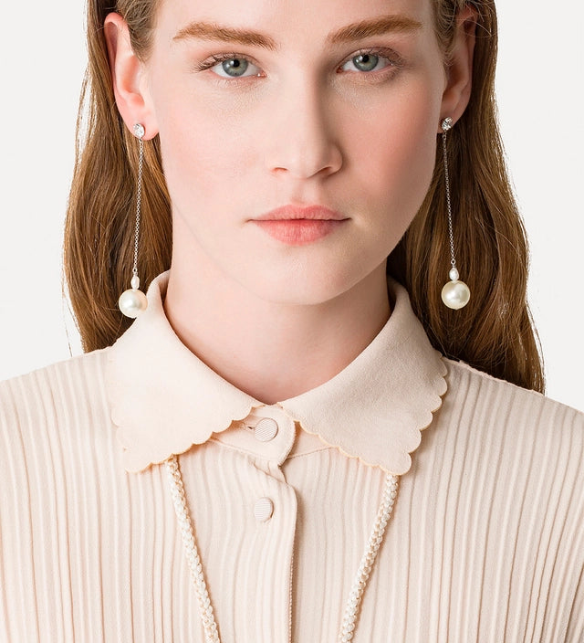 Romantic and refined, these earrings are a harmonious dance between gleaming freshwater pearls and faceted crystal droplets. Each earring features a slender elongated silhouette that sways with graceful elegance, ending in a luminous pearl drop that glimmers like dew in morning light. The crystals above catch ambient light, casting delicate reflections that softly illuminate the face—merging poetic beauty with artisanal charm.