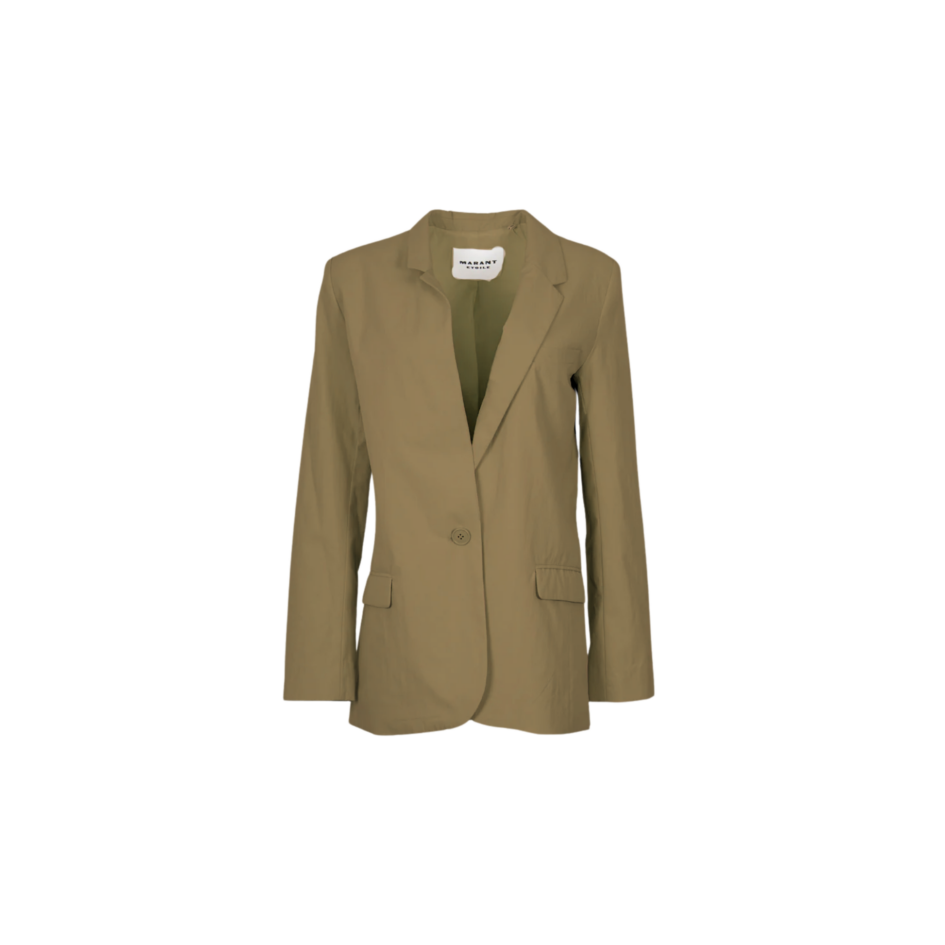 The Isabel Marant Étoile Dasia Jacket in Khaki is a study in refined modernity — its slim silhouette gracefully skims the body, anchored by a subtly asymmetric lapel that adds bold elegance. Rendered in crisp, all-natural cotton, it features long sleeves, a single front button, and understated patch pockets, merging minimalist tailoring with an arresting, contemporary edge. Effortless yet commanding, this blazer elevates everything from tailored trousers to laid-back denim.