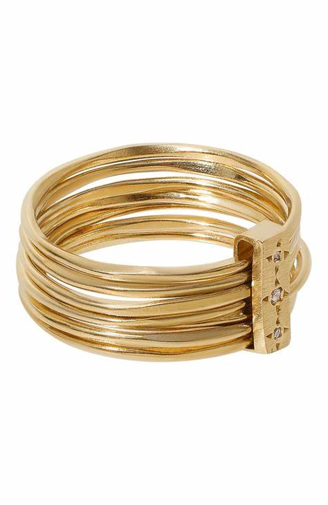 Six organically shaped round bands form the base of this sculptural gold-tone ring, all connected by a sleek horizontal bar set with sparkling cubic zirconia. A bold, modern piece that fuses texture, structure, and shine in one striking design.