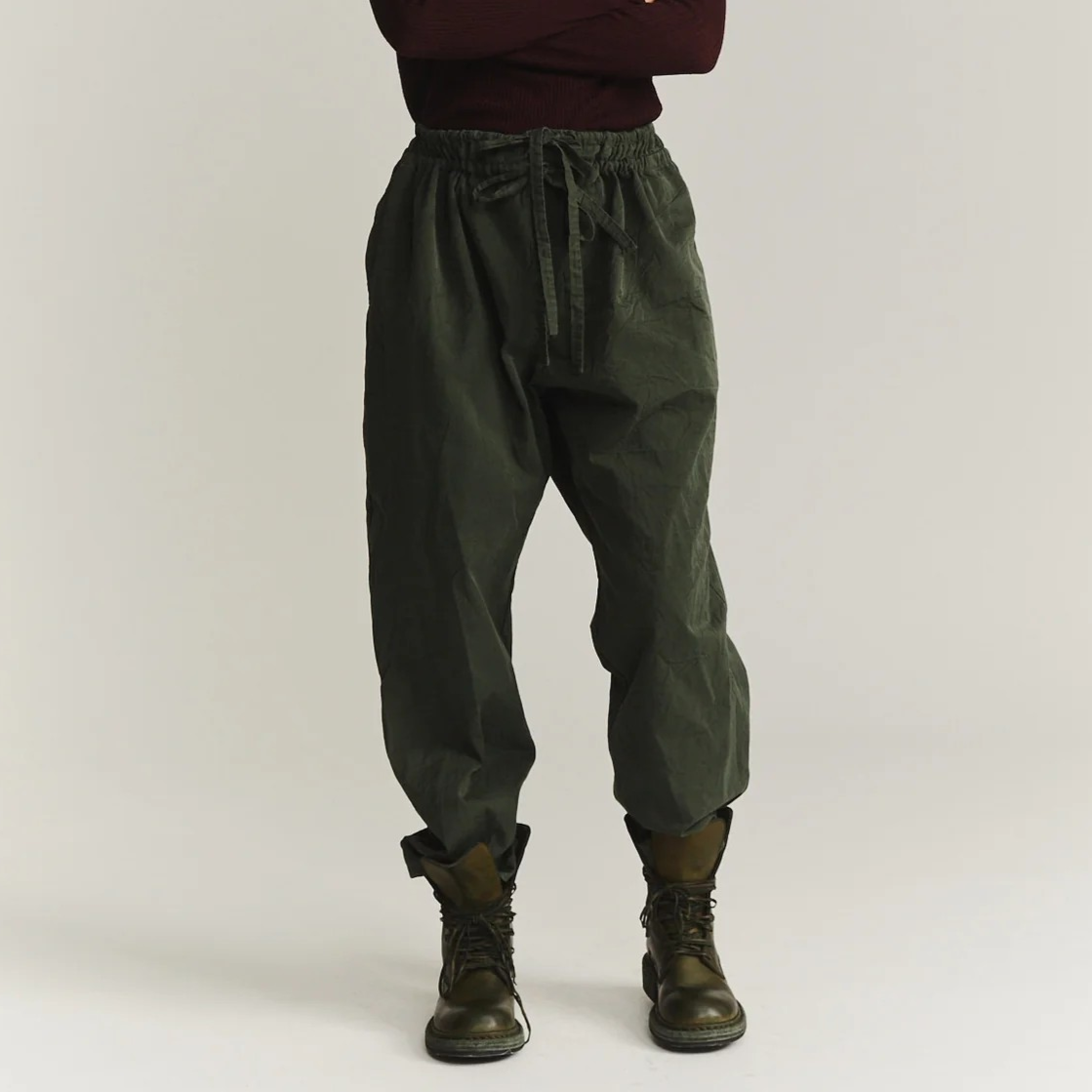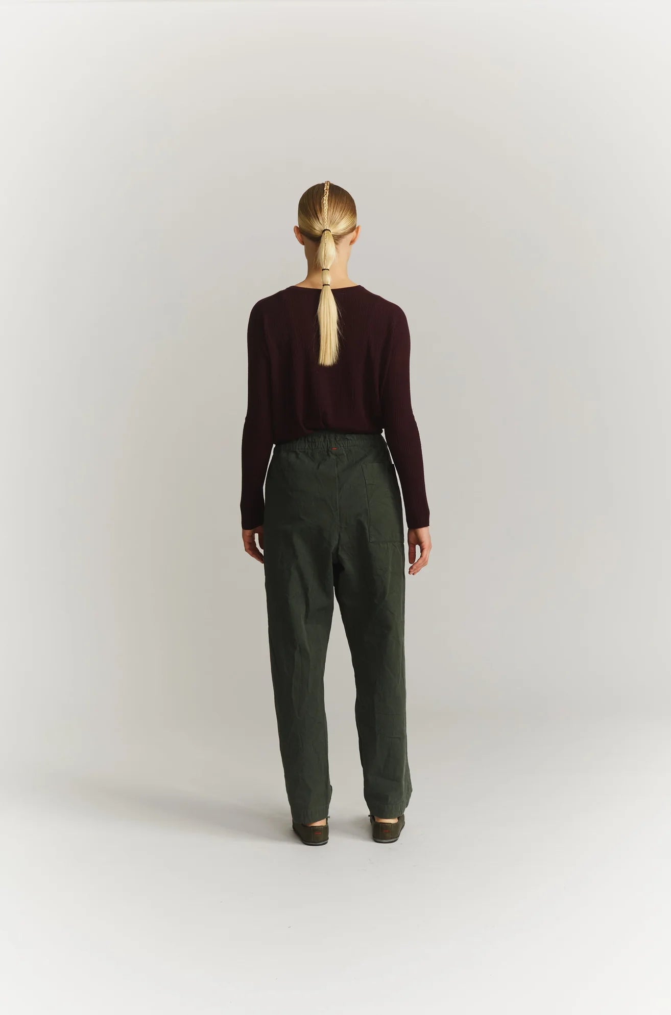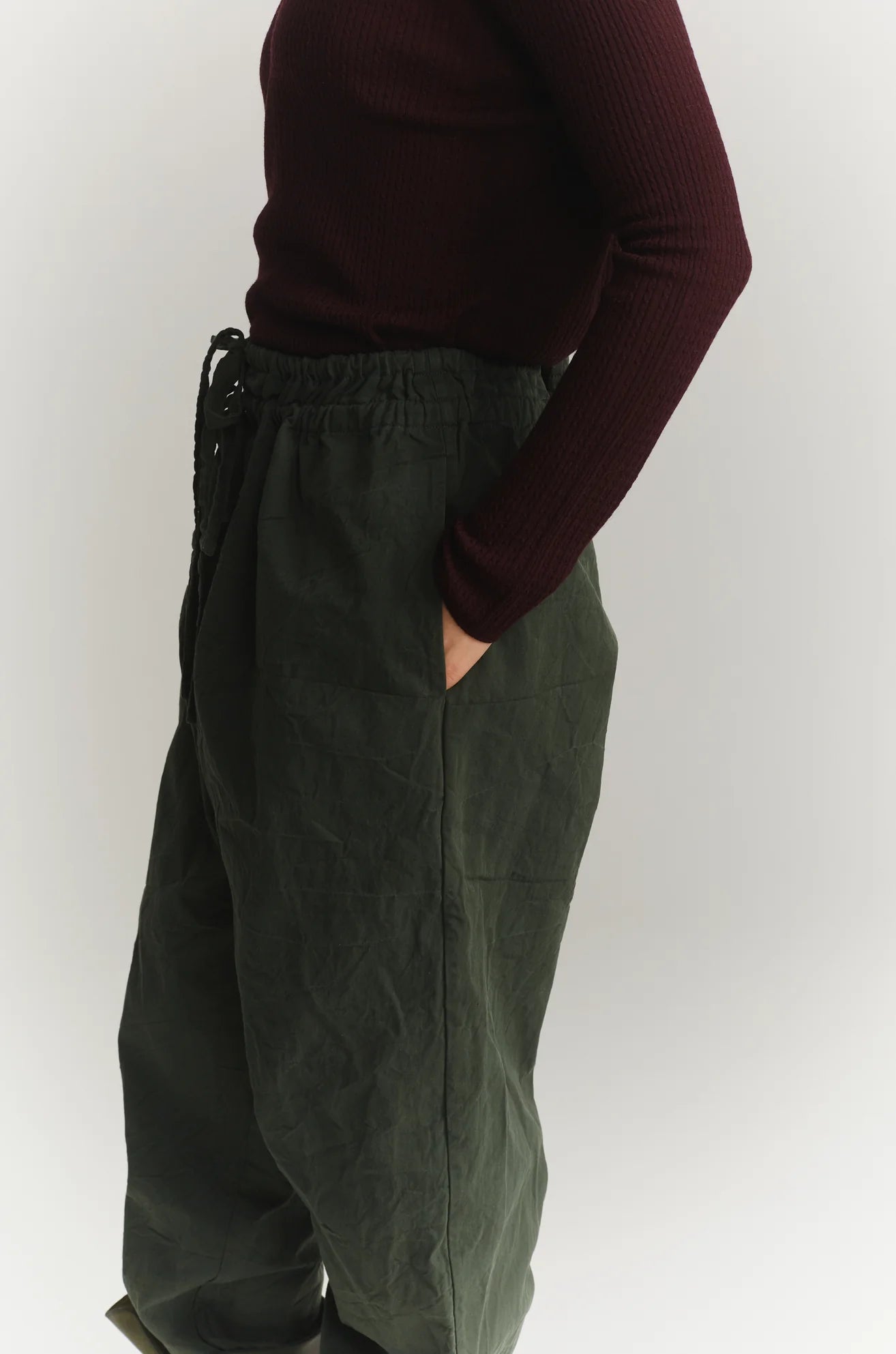 Casey Casey's Denmark Wide Leg Pant is made of double cotton and has double drawstrings at the waist. it has a patch pocket in the back with a corozo button closure.