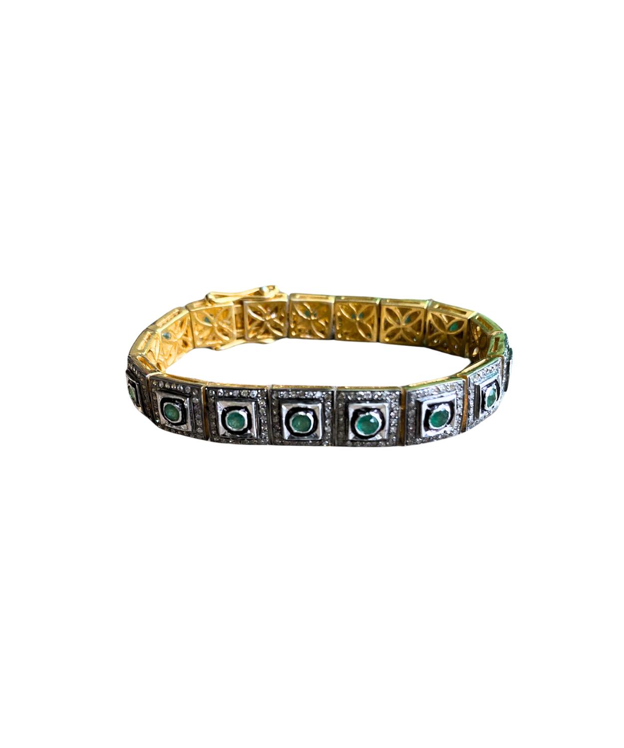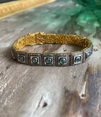 Silver tennis bracelet with polki diamonds and emeralds.