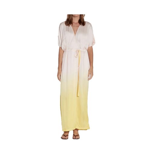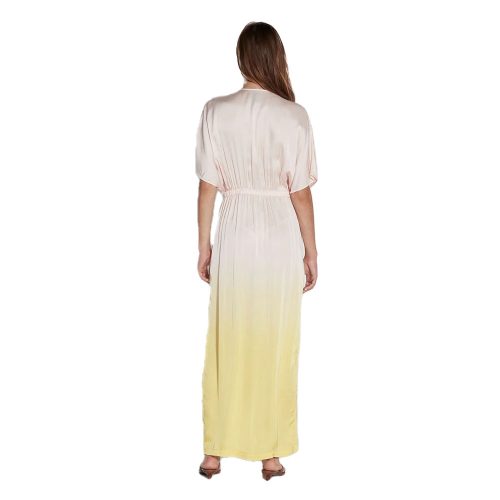 - Features: Open V-neck, draped silhouette, off-center front slit