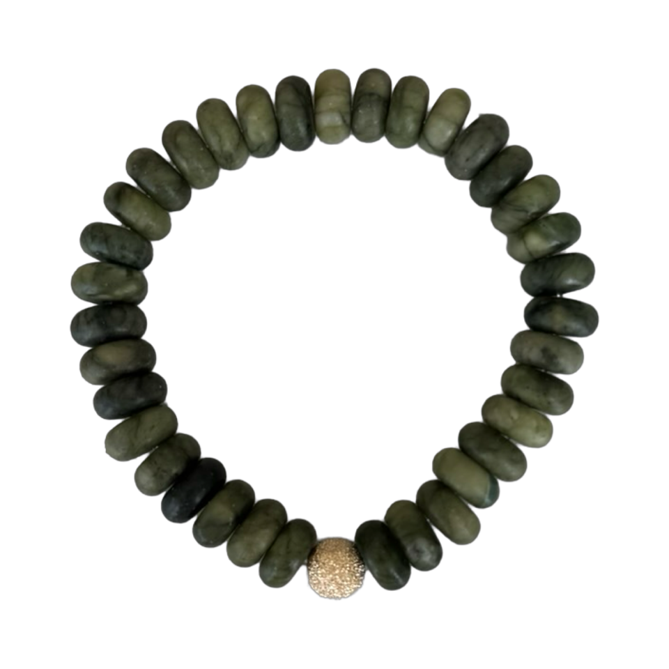One-size-fits-all bracelet crafted on a durable elastic thread, featuring jade semi-precious stones and 18k gold-plated bead