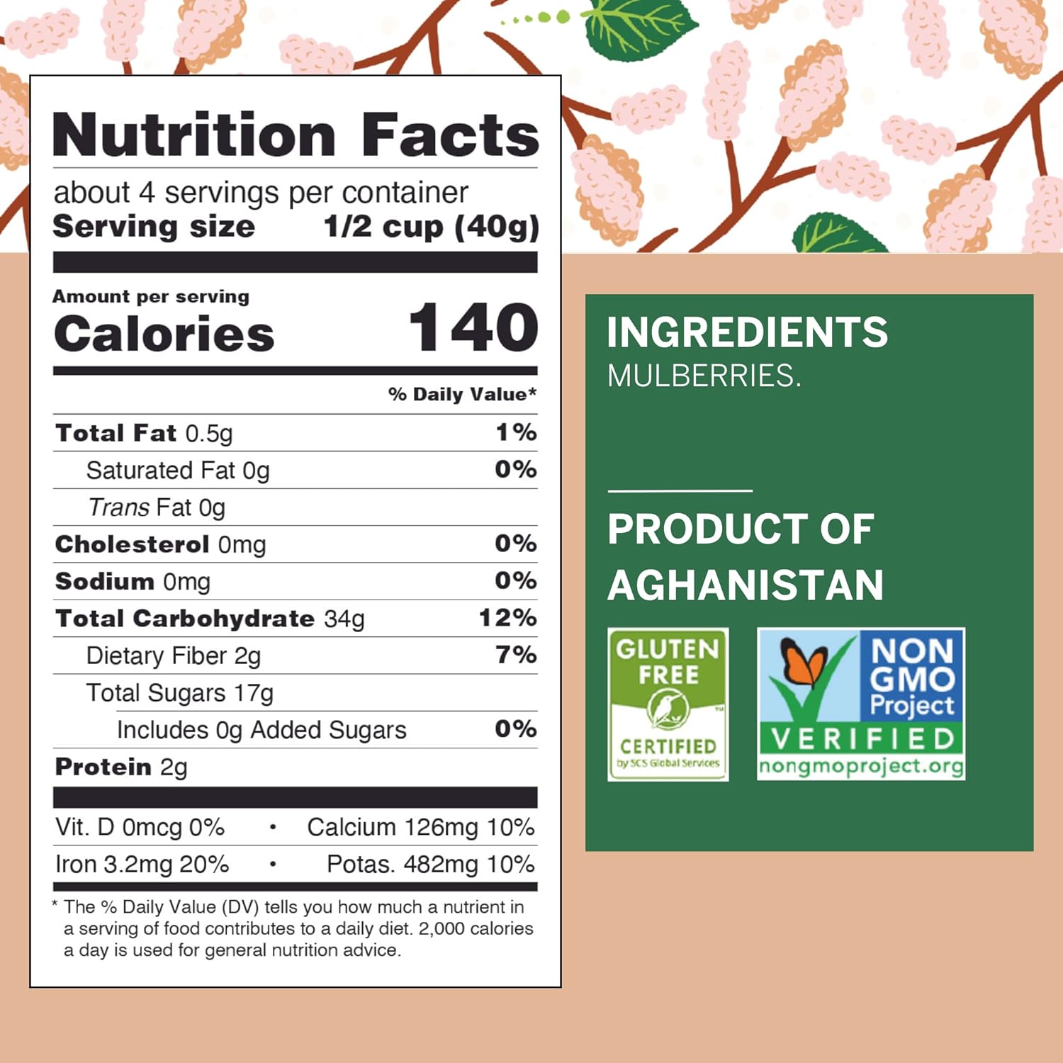 Deliciously sweet and crunchy, Ziba white mulberries grow wild in the Hindu Kush Mountains of Afghanistan. This rare superfood is a wonderful source of Fiber, Iron, Riboflavin, Vitamin C, Vitamin E and Vitamin K. Our hand-picked Afghan white mulberries are sun-dried, unlike other varieties ? making them crunchy instead of chewy. Eat them as a snack or use as a complement to any dish needing sweetness.