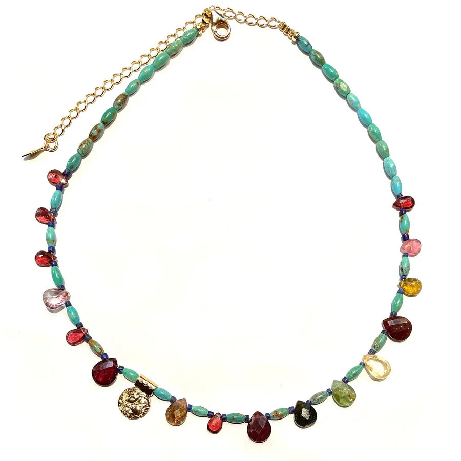 This unique necklace features turquoise rice beads, lapis lazuli, and semiprecious faceted drops (garnet, tourmaline, aquamarine...) set on a short gold plated 18k chain. Its elegant and Indian-inspired design makes it a one-of-a-kind piece that we adore.
