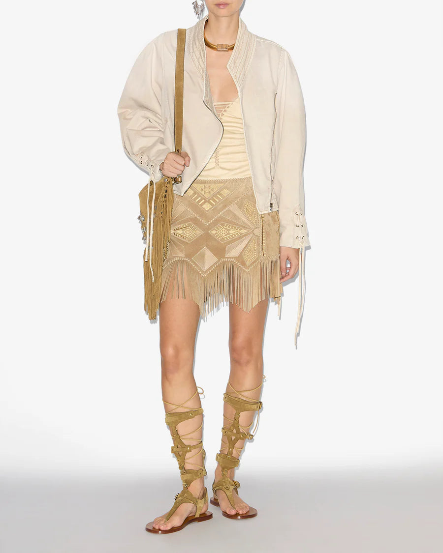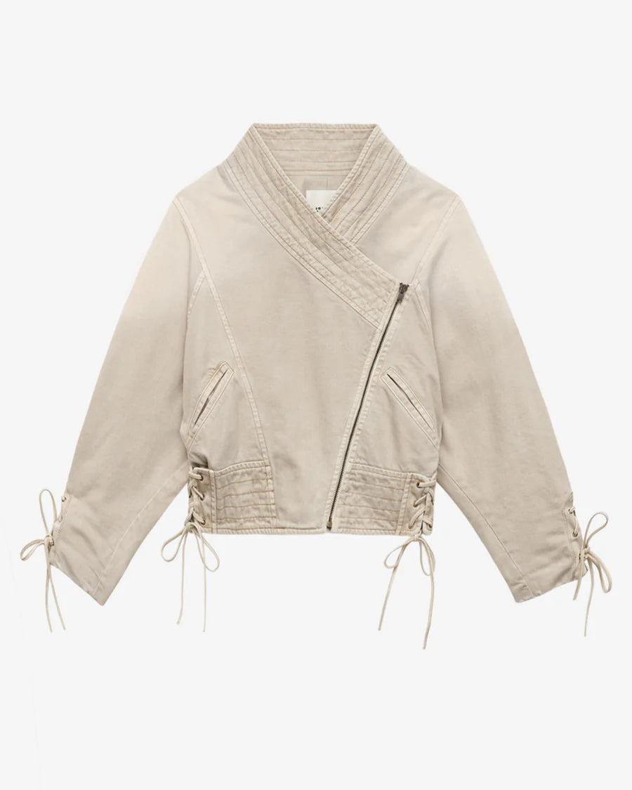 A bold take on a classic. This cropped denim jacket features a crossover V-neckline, structured padded shoulders, and long batwing sleeves for a statement silhouette. The asymmetrical zip closure and topstitched finishes add an edgy touch, while side pockets and a fitted, topstitched waistband balance utility with style. Finished with lace-up detailing on the cuffs and sides—complete with denim strings and metal eyelets—and a soft twill lining for comfort.