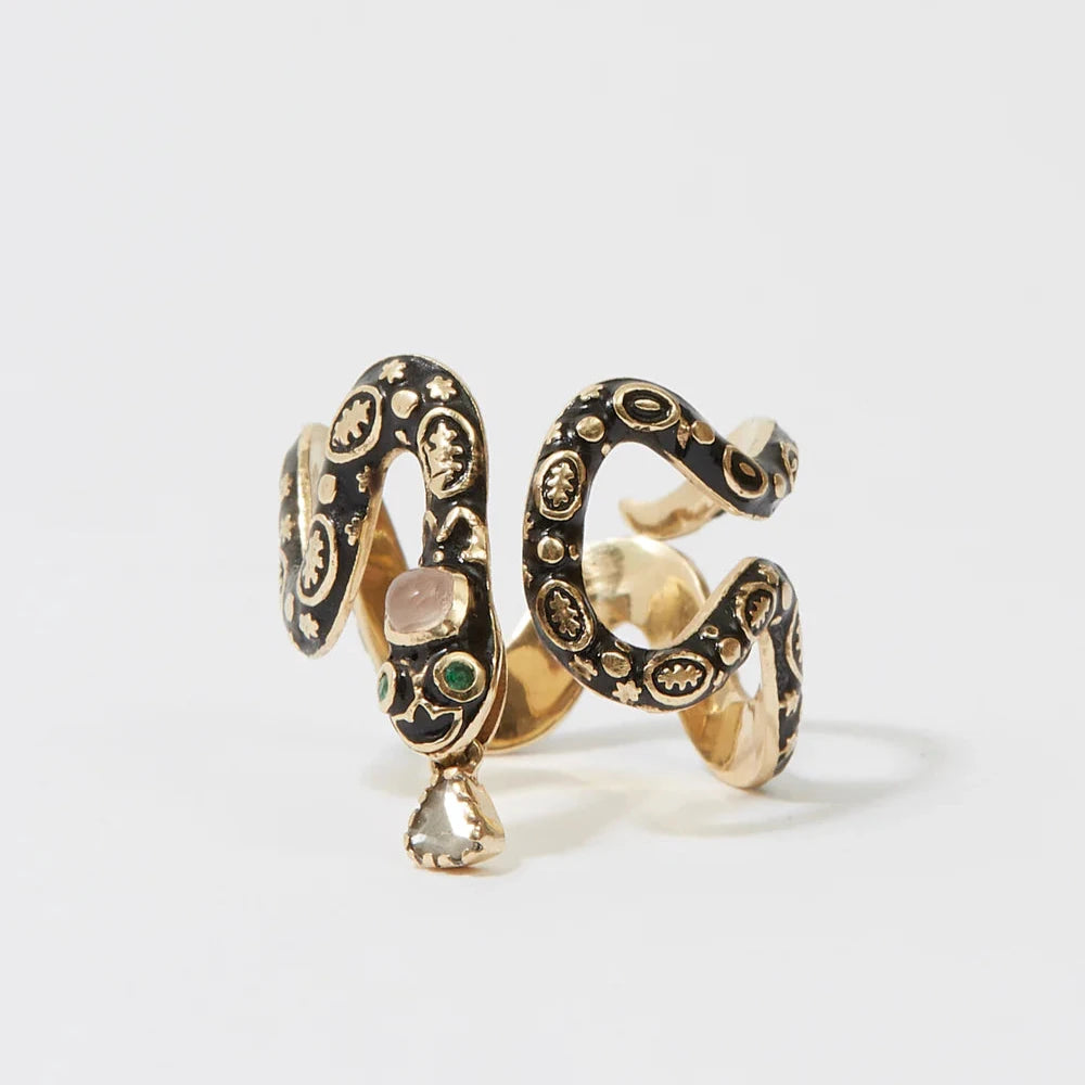 Gold and black enamel ring designed like a snake. Set with an opal, two emeralds, and a diamond dangle.