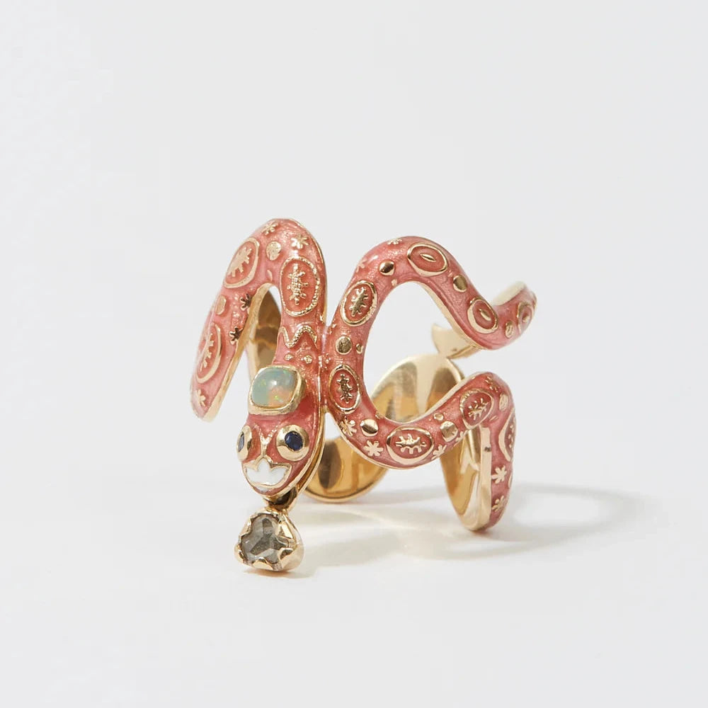 Gold and pink enamel ring designed like a snake. Set with an opal, two emeralds, and a diamond dangle.