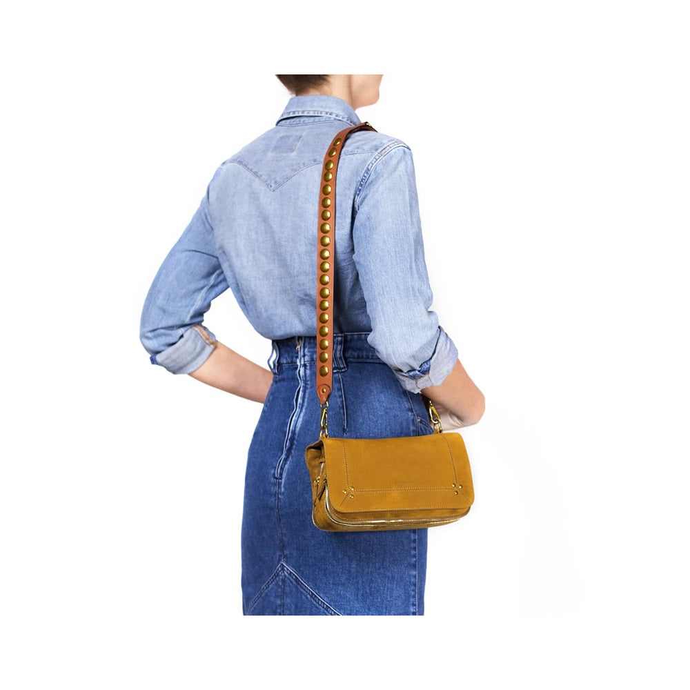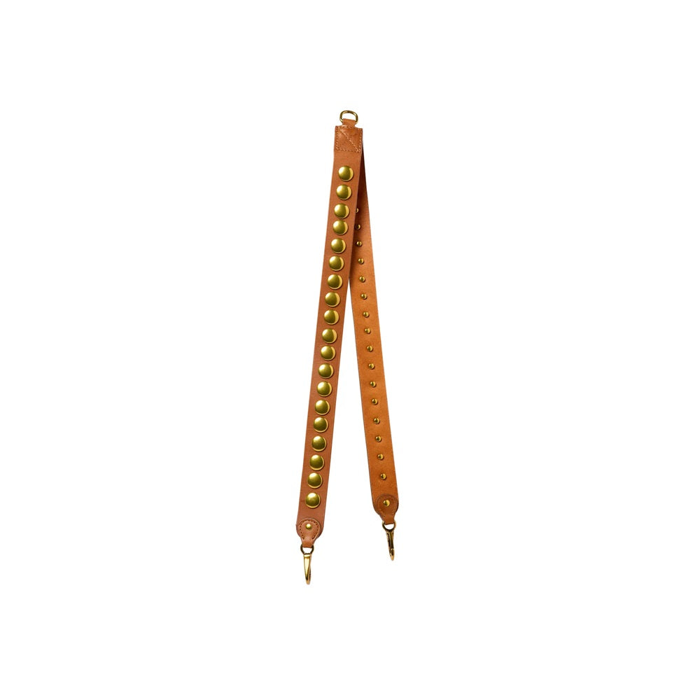 A studded leather strap designed for easy removal, thanks to the inclusion of two hooks. This versatile feature enables effortless customization and flexibility in your choice of accessories or bags.