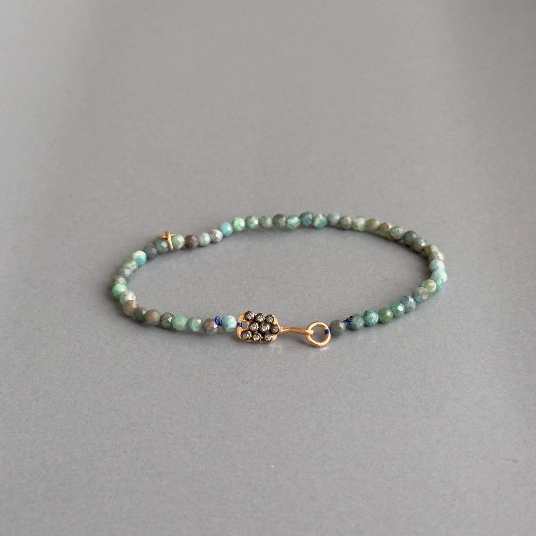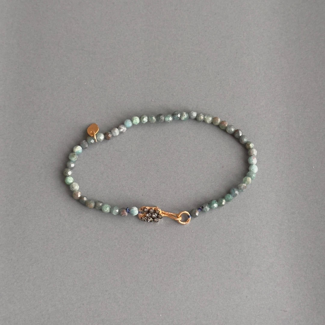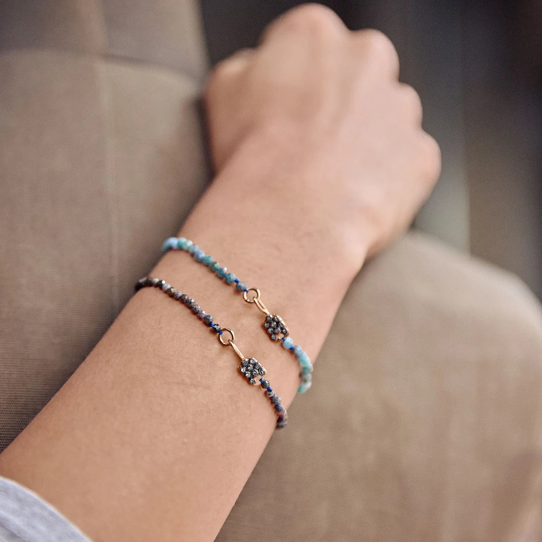 24k gold plated sterling silver and apatite stones set on a blue thread adorned with zircon stones.