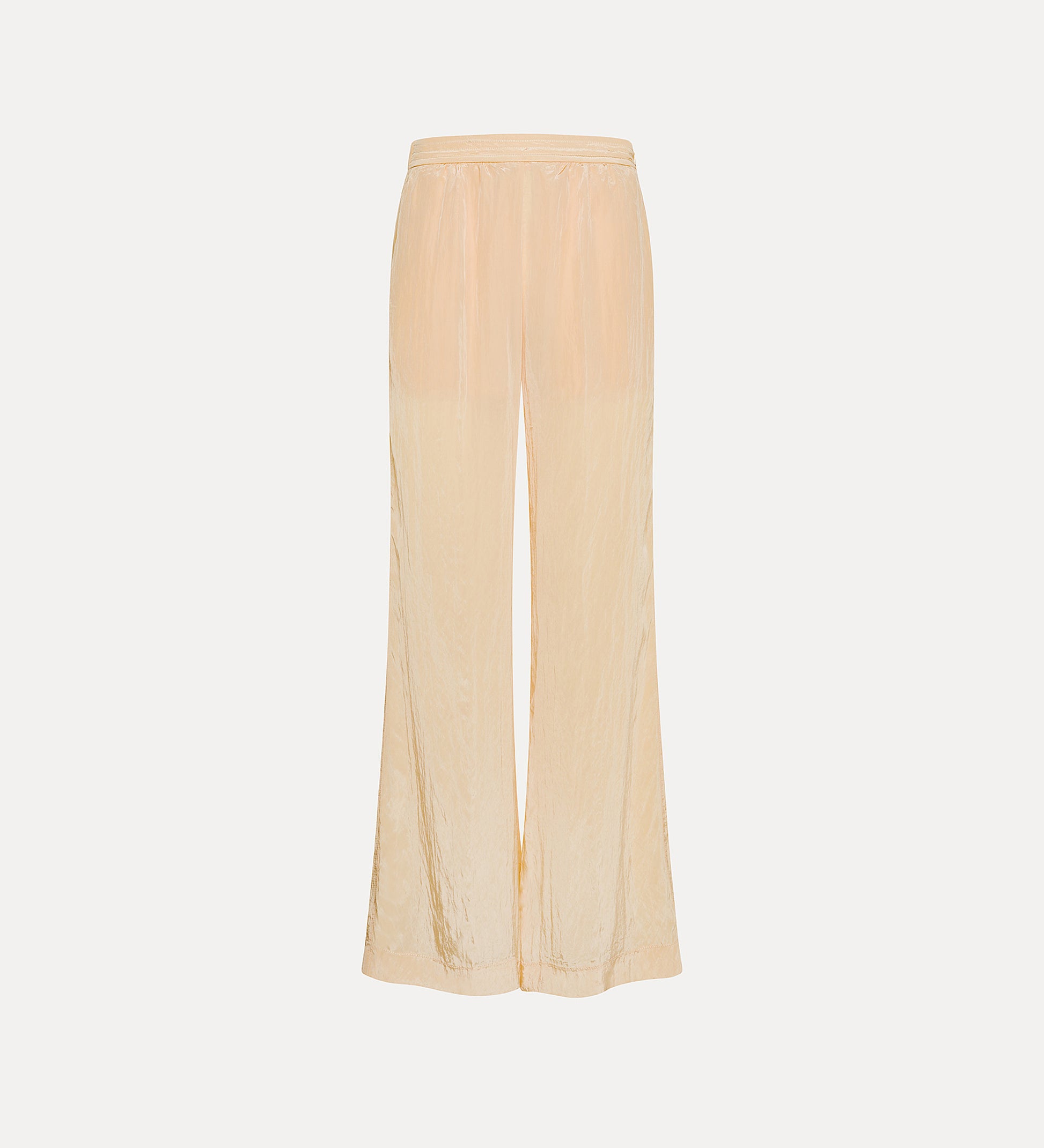 These flared trousers, crafted in lustrous viscose satin, sway with every step, blending ease and elegance. The elasticated waistband is detailed with delicate rows of topstitching, adding a refined touch of metropolitan flair. Pair them with matching tops and layer on feather or shell bijoux for a subtle bohemian accent that carries you effortlessly from dawn to dusk.