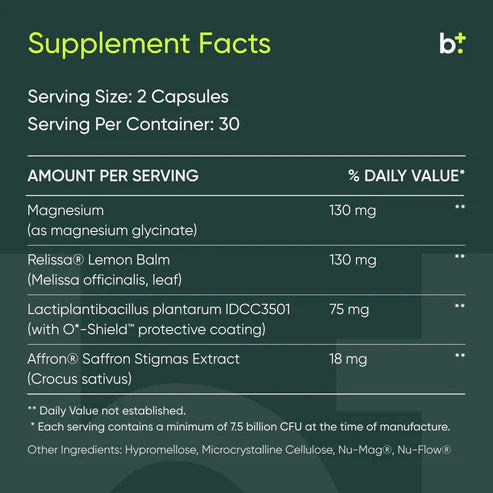 For best results, use consistently every night as part of your recovery routine. Ingredients: Magnesium Glycinate, Relissa® Lemon Balm Extract, Lactiplantibacillus plantarum, Affron® Saffron Extract.
