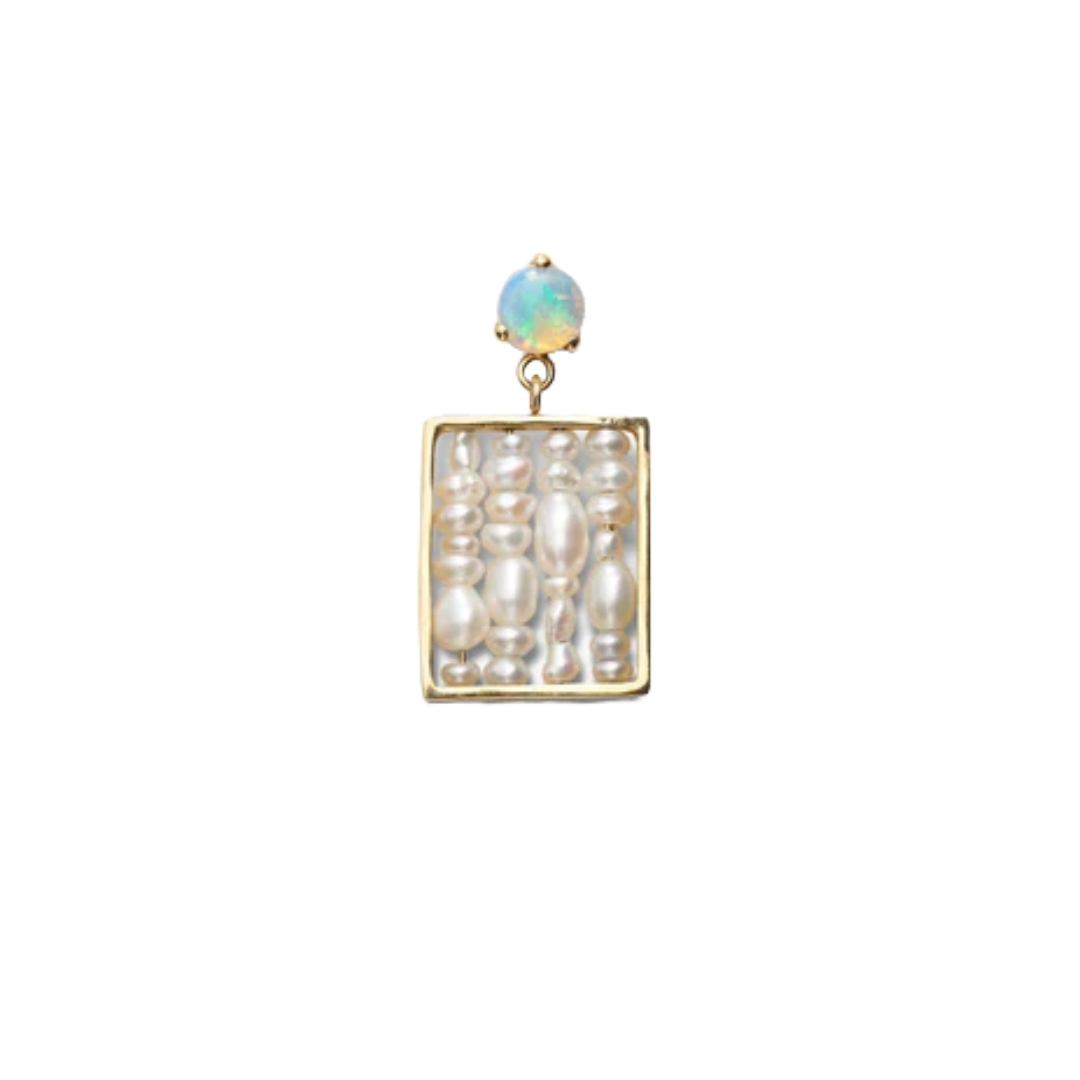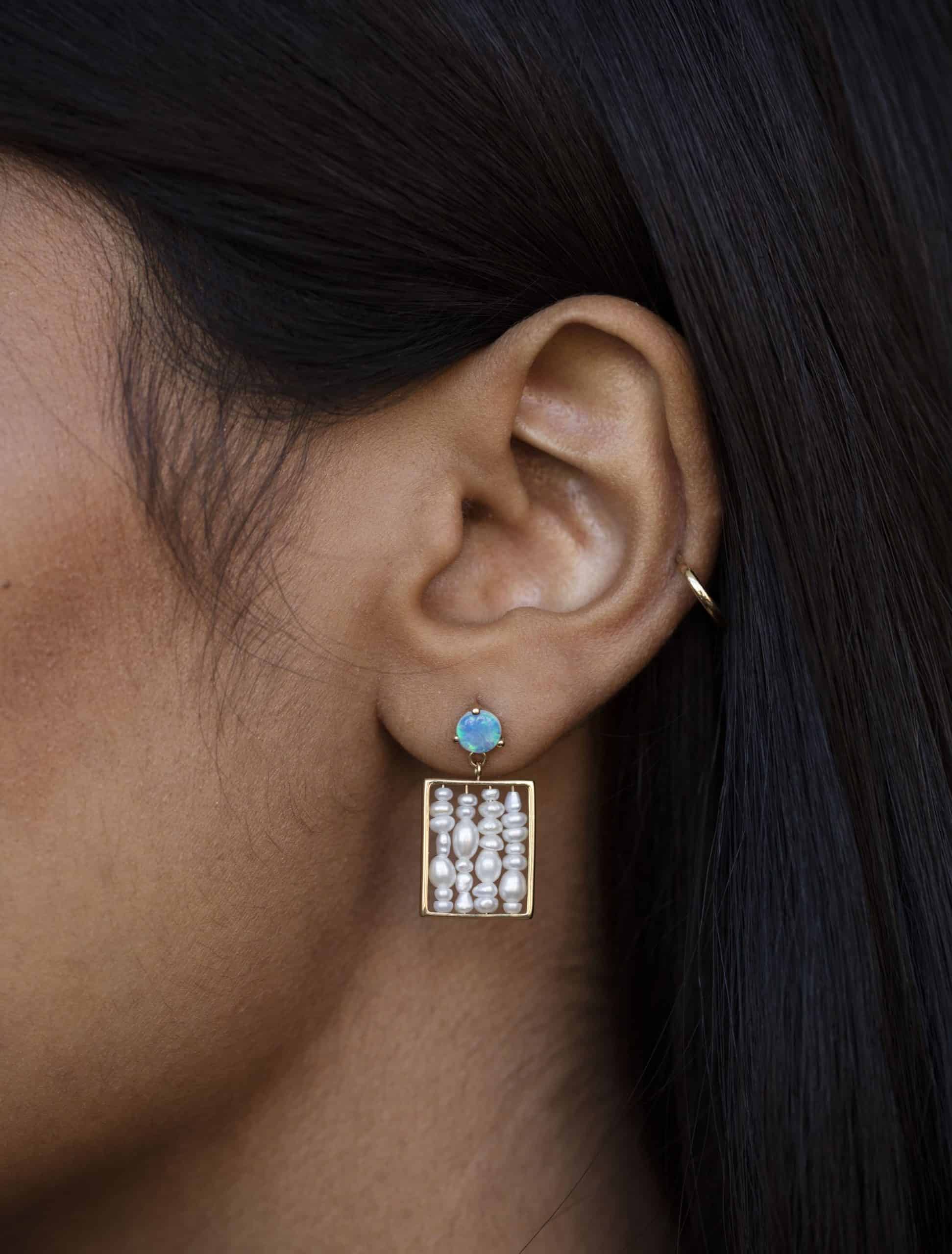 14K Small Weaving Earring Lines of delicate freshwater pearls in varying sizes evoke a tapestry. This Freshwater Pearl Earring from Wwake is framed in gold and suspended from a brilliant opal, these earrings are equally contemporary and classic.
