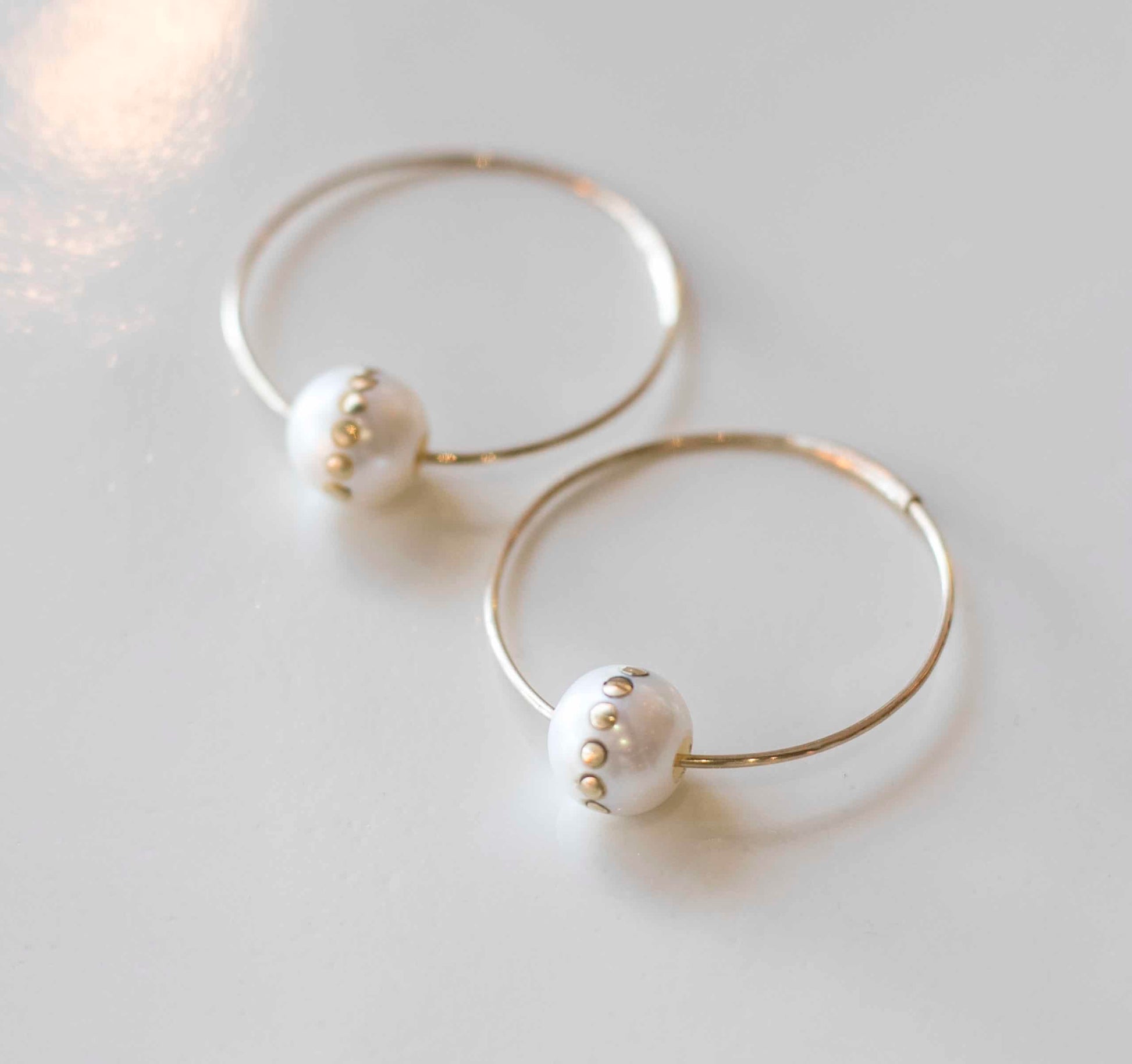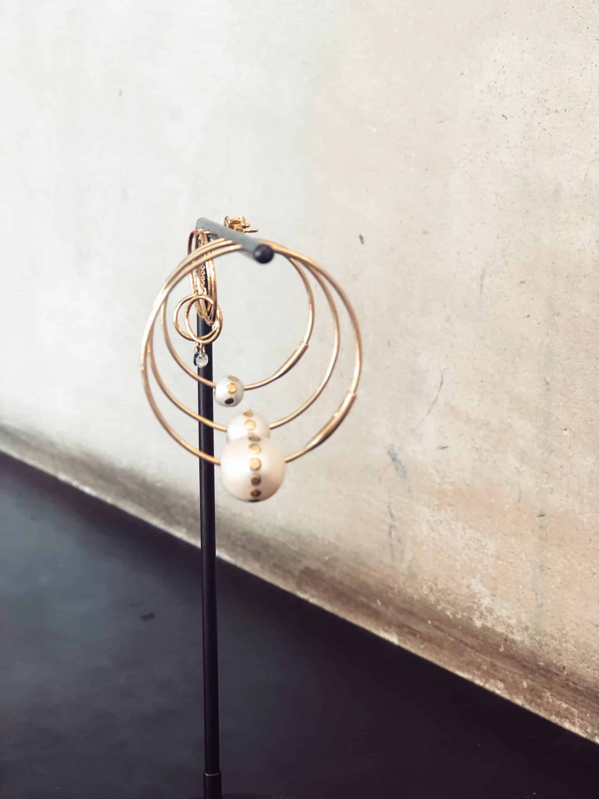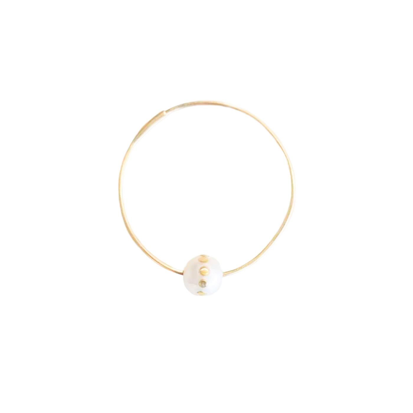 This Gold Dot Single Hoop by Comptoir 102 has a white pearl with a gold dot designed like an orbit.