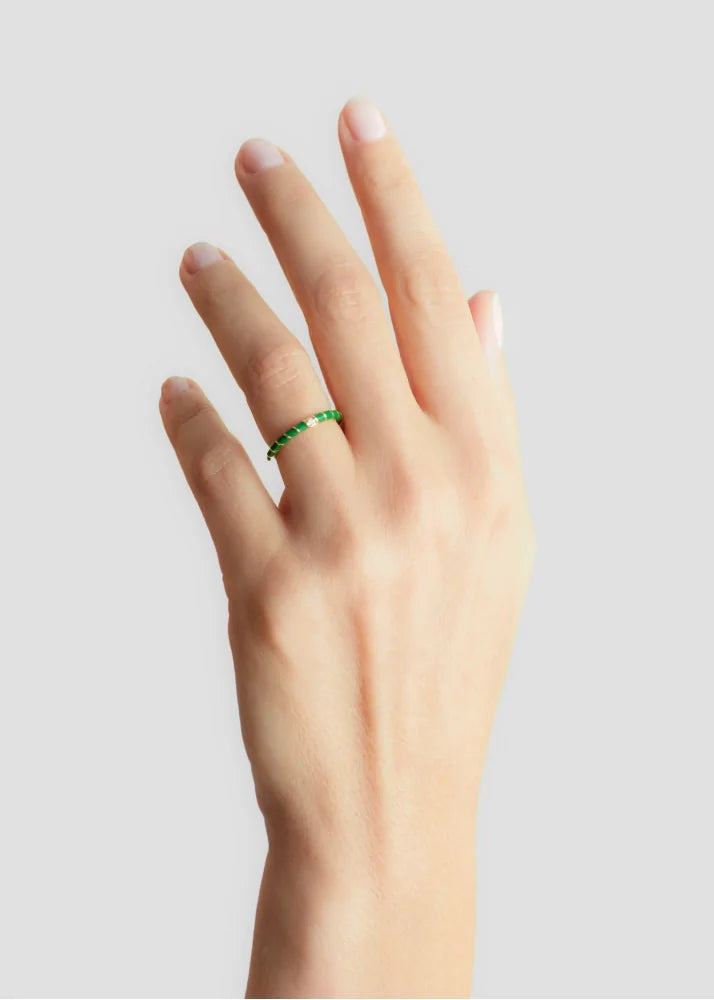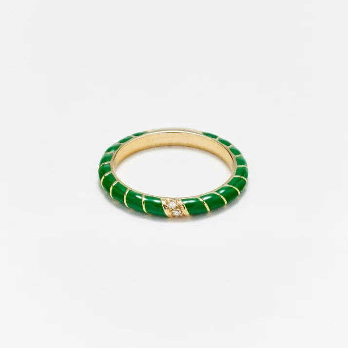 9k yellow gold and green malachite enamel twisted wedding band adorned with grey diamonds