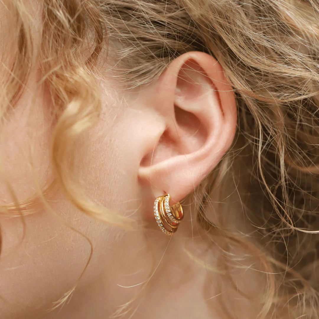A little bold, a little effortless — the High Low Triple Pavé Huggies are your new go-to for everyday sparkle with an edge. Designed to catch the light (and compliments), this trio of graduated hoops stacked in one is the kind of laid-back luxury that doesn’t try too hard. Pavé-set crystals bring the shimmer, while the asymmetrical silhouette keeps it fresh, cool, and totally you. Perfect for solo wear or layered with your favorite ear candy — this piece brings that subtle statement energy, every time.