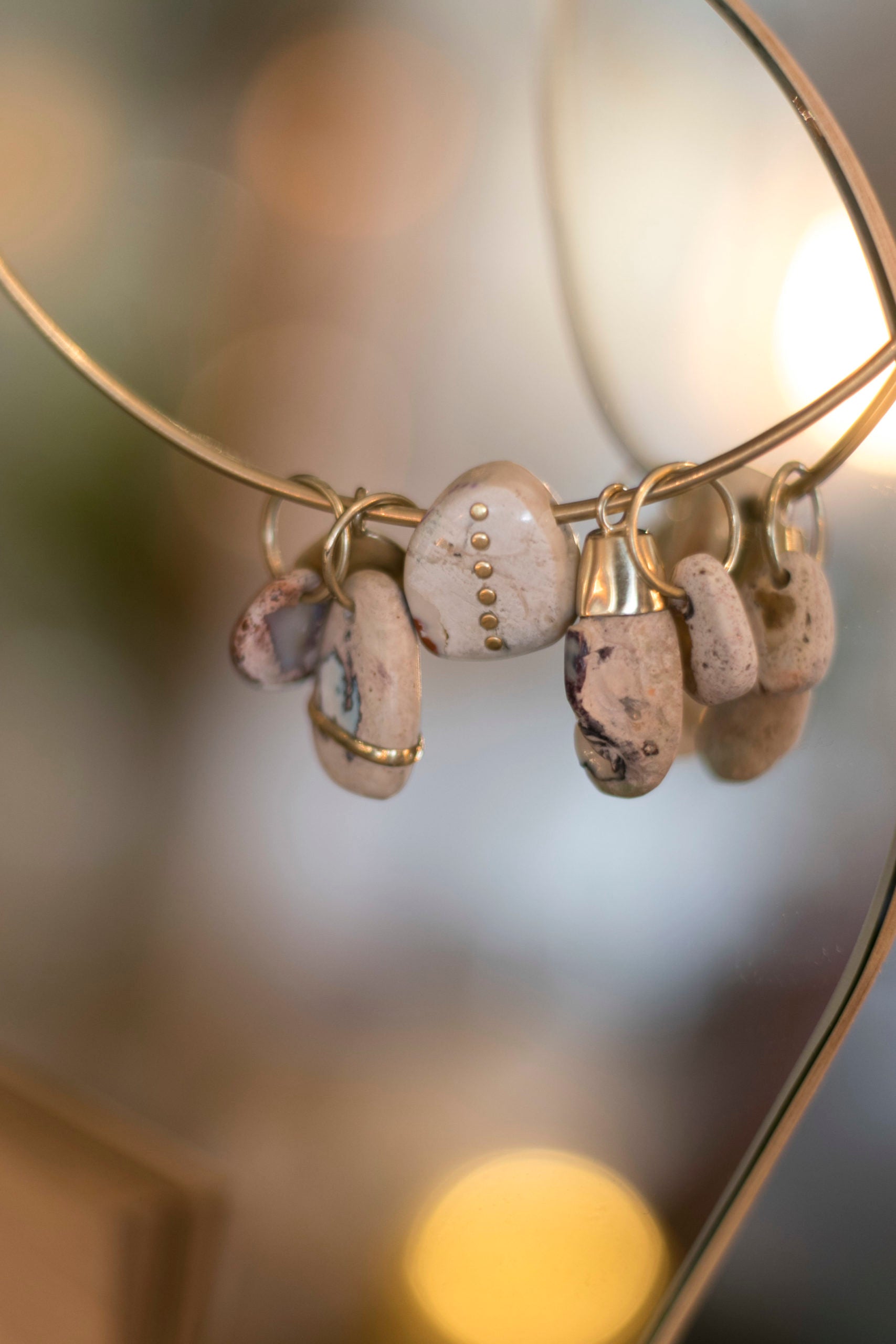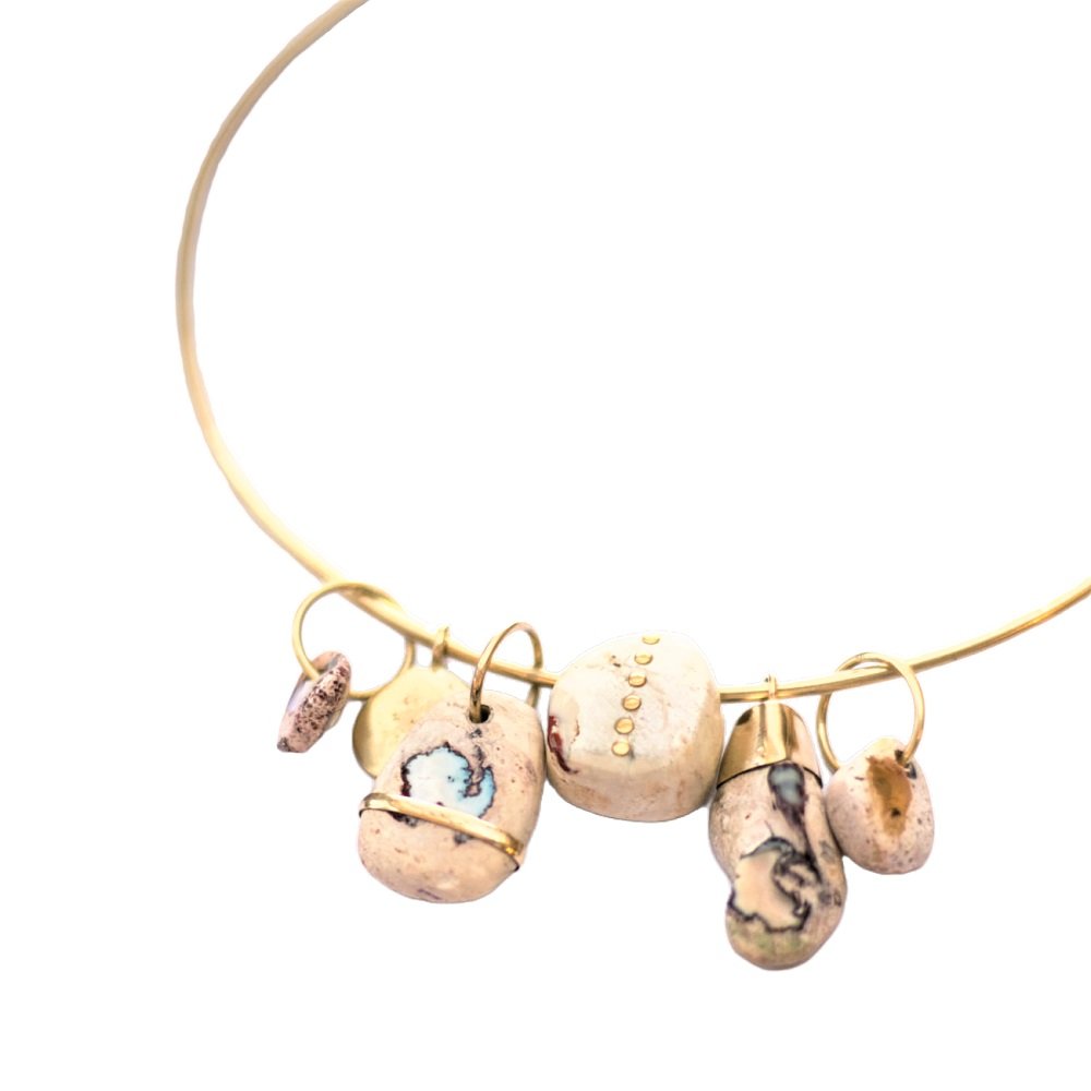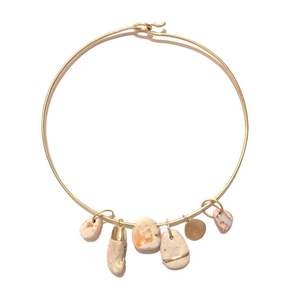 Irregular Stone Necklace from Comptoir 102 in rigid 9K yellow gold with hanging opals and yellow gold dots and line. One of a kind.