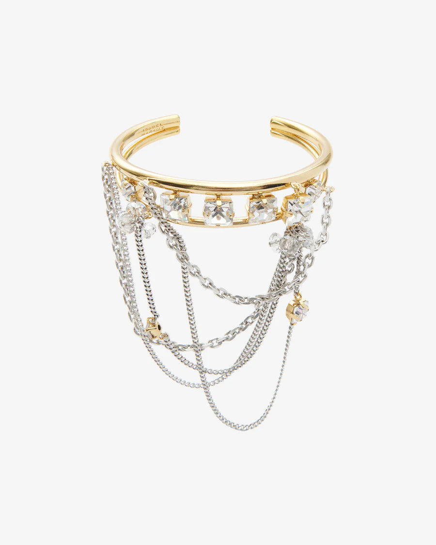 The Jodie Bracelet by Isabel Marant is a sculptural cuff that feels at once bold and delicate. In mixed silver and gold tones, it features draped chain detailing and a cluster of glass stones that cascade elegantly from its open cuff structure. With just enough shine and movement, it becomes a focal point without overpowering—perfect when you want your jewelry to speak softly, yet unmistakably.
