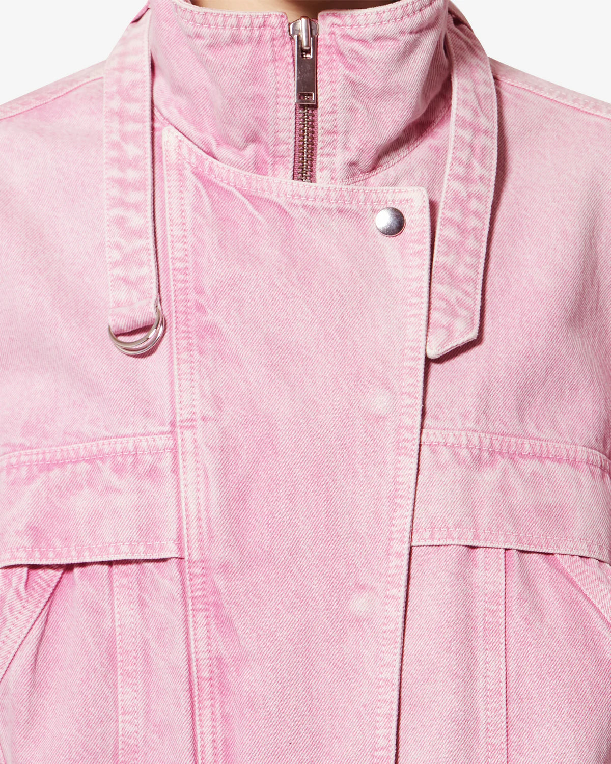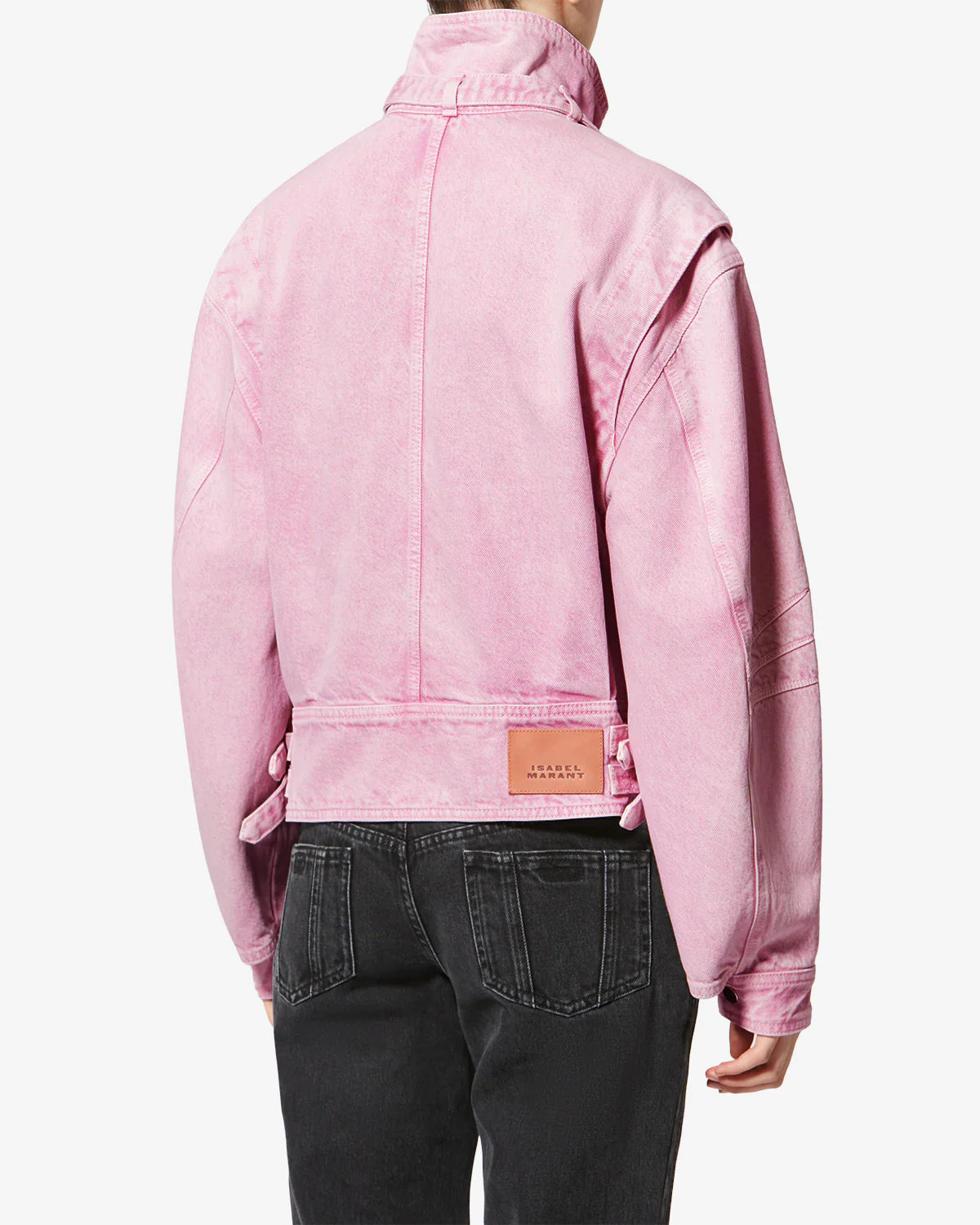 The Isabel Marant Joseline Jacket is a pink denim jacket crafted from 100% faded cotton canvas, offering a relaxed fit. Key style details include a chic adjustable stand-up collar with a metal buckle, dropped armholes, and raglan side sleeves.