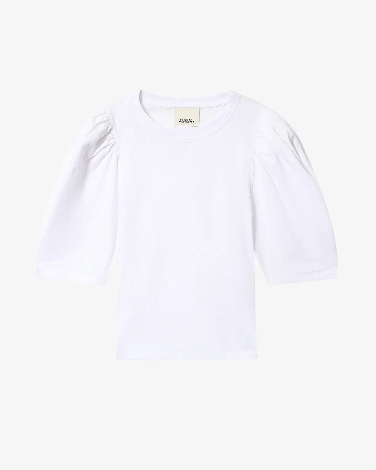 The Isabel Marant Maeliss T-shirt in White is an eco-friendly, plain-colored women's T-shirt defined by its relaxed fit and construction from 100% GOTS-certified organic cotton. This shirt features a classic round neckline finished with ribbing and short loose sleeves. As a garment with GOTS certification, its production adheres to strict environmental and social standards.